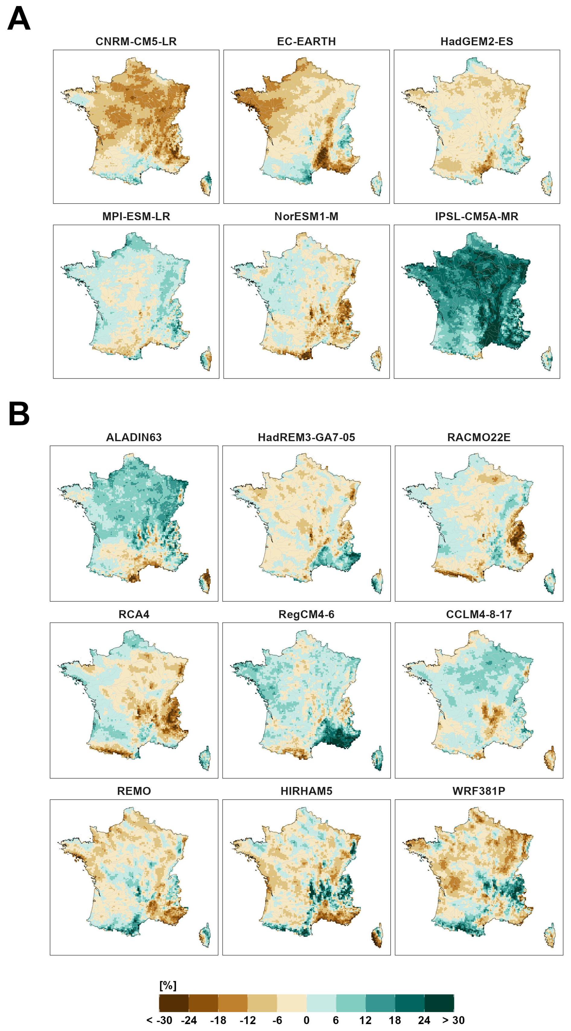 For median annual discharges, while slight increases are projected (often less than 15 %) in the North, decreases (up to −30 %) are projected in the South. With the exception of the Pyrénées and the southern Alps, where most models project a decrease, modeling chains do not agree on the sign of change. The inter-model dispersion is very important. Large decreases are projected for the driest chains (up to −75 % in the South-East) while large to very large increases are projected for the most humid ones (up to 75 % in the North).