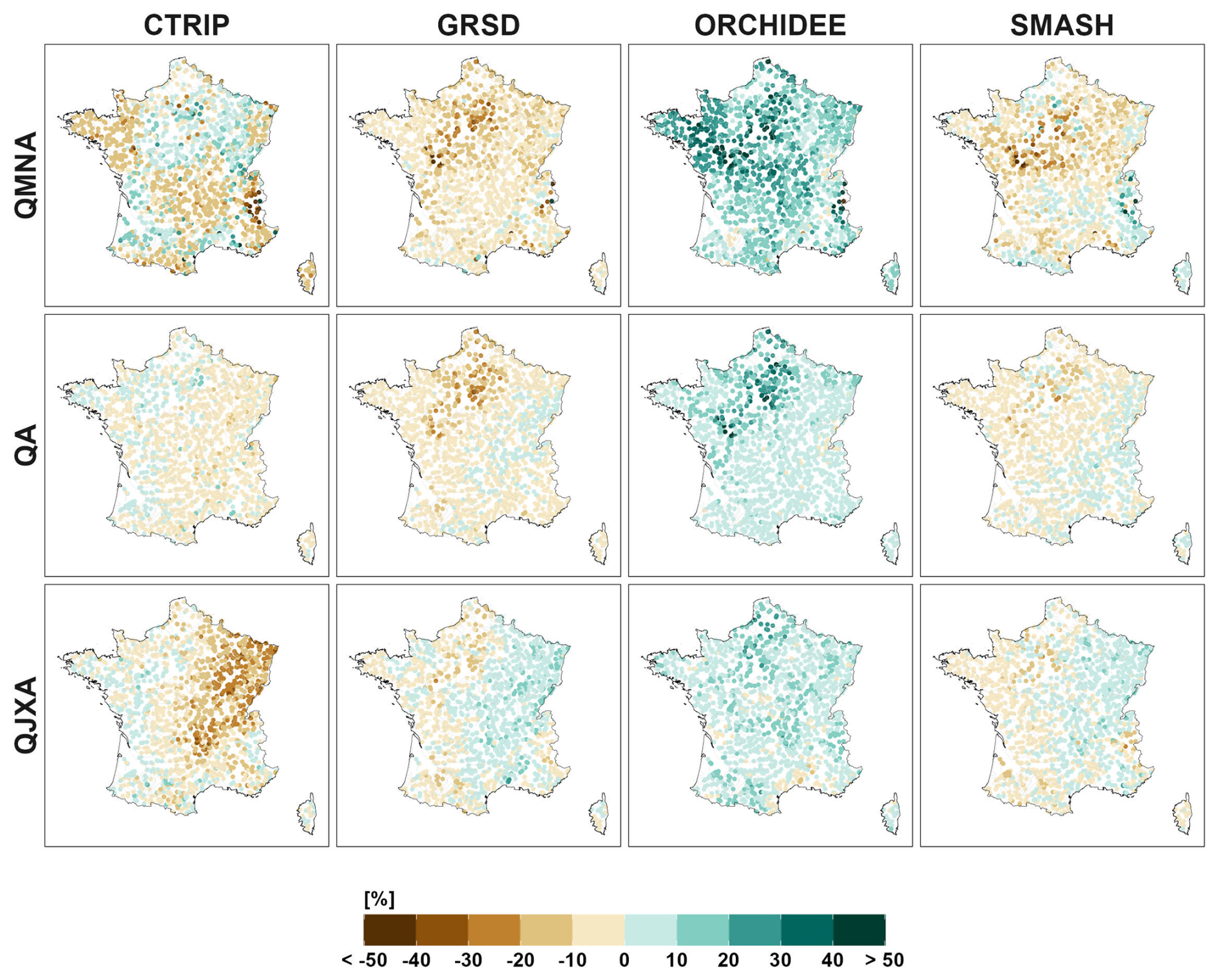 Explore2 hydrological projections offer a “natural reference hydrology” as a foundation for future studies on water allocation. Streamflow simulations are provided in the absence of any water management interventions – such as abstractions, releases, or reservoir operations – thus representing natural flow conditions. In this study, we assess an ensemble of hydrological projections obtained for 1735 simulation points with four HMs of different types (Table 2) covering almost all the country, namely CTRIP, GRSD, ORCHIDEE and SMASH (Fig. 1). The Explore2 MME provides hydrological simulations with nine HMs, but the five other HMs cover only specific regions of France and for fewer catchments (Sauquet et al., 2025a). SMASH and GRSD HMs are conceptual “bucket” type models. CTRIP and ORCHIDEE are land surface models and physically based. No single model provided discharge simulations for all simulation points across the study area. Some simulation points could not be reliably paired with their corresponding locations in the hydrographic network (or were excluded due to large differences in simulated versus physical catchment areas). All HMs used the same meteorological forcings: the reanalysis SAFRAN as the reference dataset for the period 1976–2005 and adjusted scenarios for historical and future climate experiments. Calibration of each HM, if required, was model-specific and carried out automatically or manually based on the expertise of the model developers. To assess model performance, all HMs have been evaluated within a standardized framework, focusing on their ability to replicate various observed hydrological signatures for the current climate (see Sauquet et al., 2025a, for evaluations).