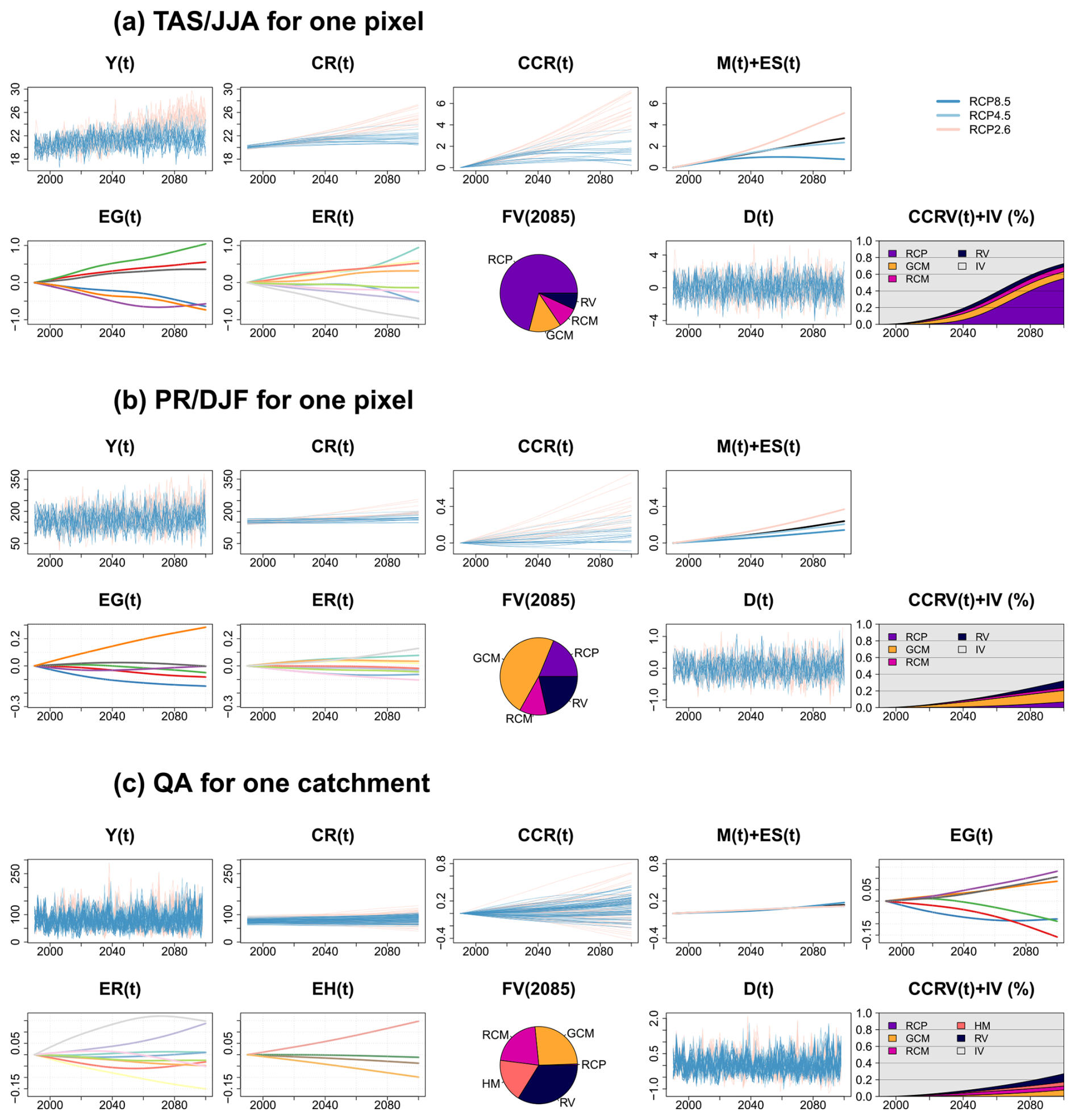To characterize how a given climate or hydrological indicator is projected to change, we use the QUALYPSO method (Evin et al., 2019). QUALYPSO focuses on the climate change response (CCR) projected for the considered indicator. The CCR projected by a given simulation chain defines, for any future time, the absolute or relative difference of the long-term climate response for this future time compared to the reference period. The QUALYPSO method is implemented in an R package (Evin, 2023) and was specifically designed to tackle the main challenges of uncertainty partitioning in unbalanced and incomplete MMEs. More information is provided in Appendix A, including an illustration of the different steps in Fig. A1.