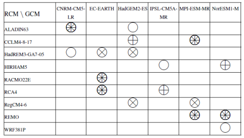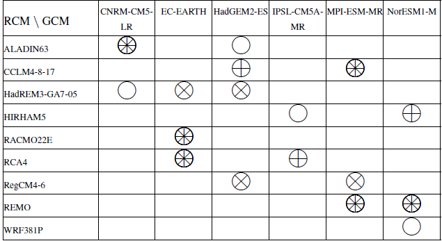 Table 1Unbalanced ensemble of EUROCORDEX combinations used for Explore2 climate projections with the scenarios RCP2.6 (×), RCP4.5 (+) and RCP8.5 (◦). Only one run was used for each GCM (member r1i1p1 for all GCMs except for EC-EARTH where the member r12i1p1 has been used). All HMs were forced by all climate projections.