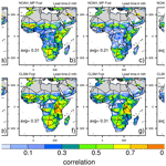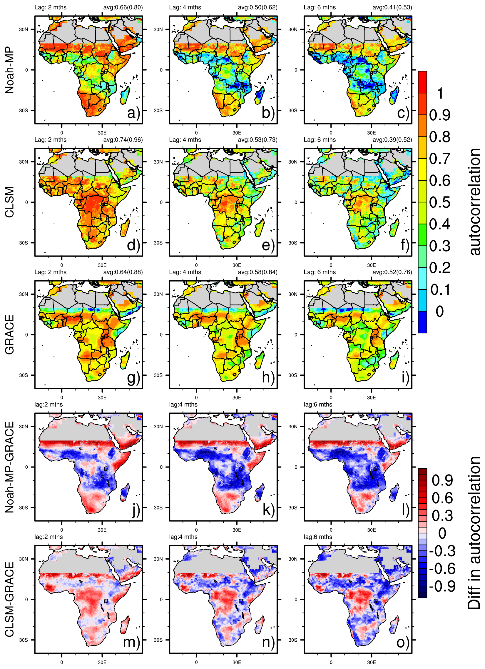 Persistence refers to the tendency of a process or variable in retaining its past state (wet or dry conditions) and has been known to help enhance hydrological prediction skill. To examine persistence, we computed the autocorrelation of TWS time series from the two re-analyses and GRACE/FO data at three lags (Fig. 7, top three rows). Autocorrelations for the two models exhibit distinct spatial patterns. Noah-MP simulates higher autocorrelation, suggesting stronger persistence, in the drier northern and southern Africa, whereas CLSM reanalysis exhibits higher autocorrelations across the wetter central Africa.