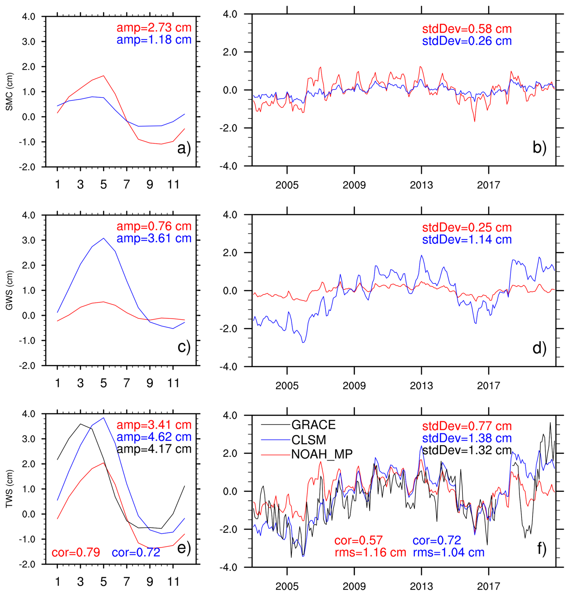 CLSM also better captured the seasonal amplitude of TWS changes as observed in GRACE data (Fig. 1e). Although seasonal variations simulated by both models show >0.7 correlations with GRACE/FO data, their seasonal maxima lag that of GRACE/FO data by two months, likely due to deficiencies in model physics and errors in the meteorological forcing fields.