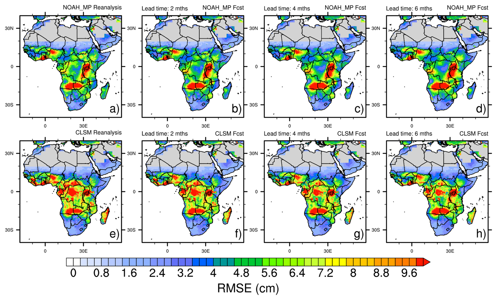 RMSEs of the ensemble mean TWS hindcasts of all NMME models, with respect to GRACE/FO data, exhibit distinct spatial patterns (Fig. 3). Large RMSEs are observed in the interior western Sahel, a large region across Lake Victoria, Lake Tanganyika, and Lake Volta as well as southern Zambia and Angola, for both models. As the models do not simulate surface water which is detected by GRACE/FO satellites, unresolved surface water dynamics and water management activities may have contributed to errors in lake areas. In addition, uncertainties in precipitation forcing data, from both reanalysis and hindcasts may further amplify errors in simulated TWS. As discussed earlier, the East African Rift region, which includes Lake Victoria, has seen increased precipitation variability (Boergens et al., 2024); similarly, Southern Africa including southern Angola has been experiencing erratic precipitation patterns and more severe meteorological droughts in recent years (Trisos et al., 2022; Correia et al., 2025). However, considering that the reanalysis exhibits similar spatial patterns and magnitudes of RMSEs as the hindcasts (Fig. 3a, e), these results suggest that deficiencies in model physics are the dominant contributor to RMSEs in TWS hindcasts.