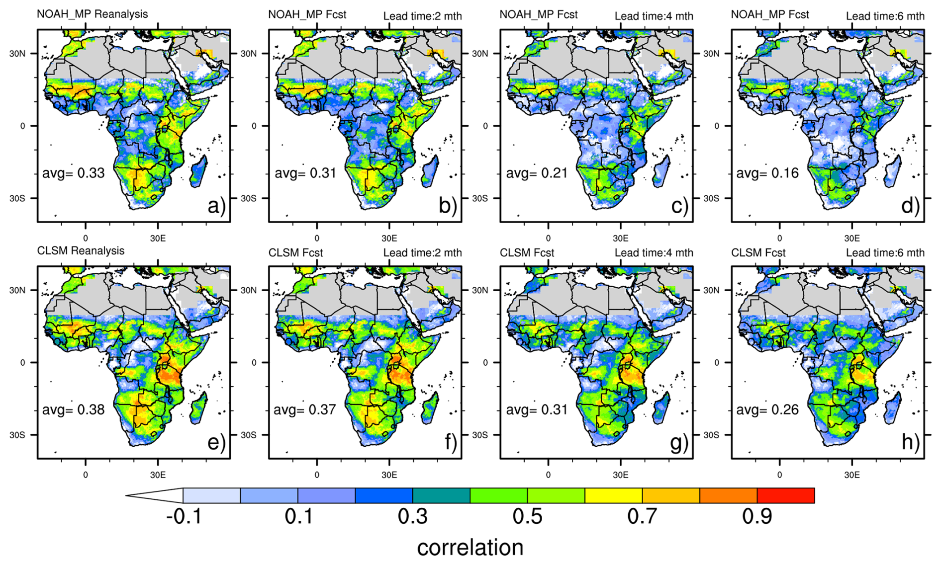 Correlation between the ensemble mean TWS forecasts of all NMME models and GRACE/FO data exhibits similar spatial patterns between Noah-MP and CLSM (Fig. 4), suggesting precipitation plays a stronger role in correlation than model physics. However, the strength of those correlations differs notably between the two models, especially at long lead times with higher average correlation for CLSM. Correlations decrease with lead time for both models, but more rapidly for Noah-MP which, on average, decreased by 48 % from the 2- to 6-month lead time, compared to the 27 % decrease with CLSM. Most of the deterioration in correlation is observed in central Africa where mean annual precipitation is the largest (Supplement Fig. S1a), reflecting larger precipitation uncertainty in wet regions and the model's response to such uncertainty.