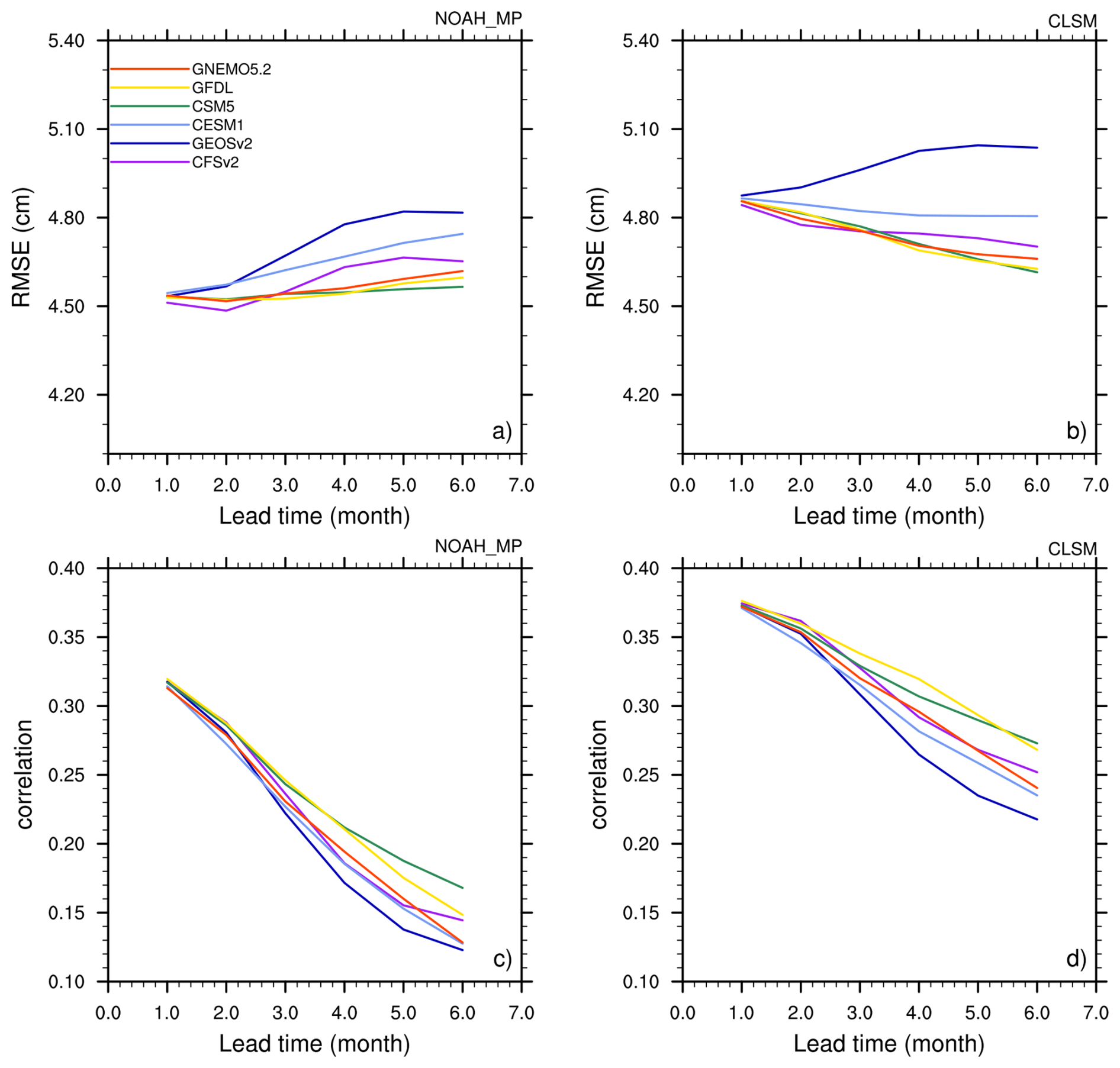 RMSEs of TWS forecasts by individual NMME models exhibit contrasting behaviors with respect to lead time between Noah-MP and CLSM (Fig. 5a, b). RMSEs of TWS forecasts increase with lead time for Noah-MP, reflecting growing uncertainty in meteorological forecasts. In contrast, RMSEs of CLSM forecasts decrease with lead time, except for forecasts driven by GEOSv2. As shown in previous studies (e.g., Li et al., 2019b), CLSM has the tendency to overestimate TWS dynamic ranges. Because interannual variability of NMME precipitation forecasts generally decreases with increasing lead time (Supplement Fig. S3), this overestimation is progressively damped, leading to reduced RMSEs at longer lead times. On the other hand, GEOSv2 precipitation exhibits substantially larger interannual variability than other NMME products, which remains strong across all lead times and leads to slightly increasing RMSEs with lead times (Supplement Fig. S3).