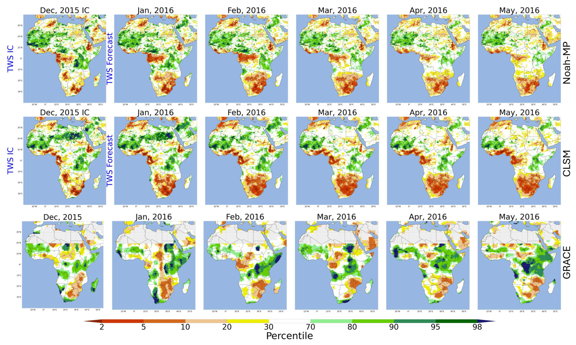 Figure 9TWS percentile maps derived from Noah-MP and CLSM ensemble mean TWS forecasts (top two rows) of all NMME models, initialized in December 2015, and corresponding maps for GRACE/FO data (bottom row).