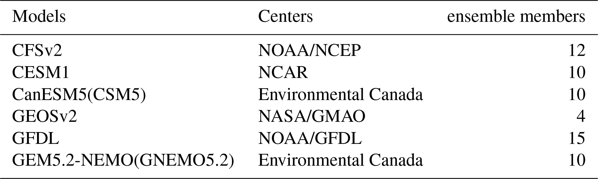 Table 1NMME precipitation hindcast specifications. CFS: Climate Forecast System; CESM: Community Earth System Model; CanESM: Canadian Earth System Model; GFDL: Geophysical Fluid Dynamics Laboratory; GEM: Global Environmental Multiscale; NEMO: Nucleus for European Modeling of the Ocean; NCEP: National Centers for Environmental Prediction; NCAR: National Center for Atmospheric Research; GMAO: Global Modeling and Assimilation Office.