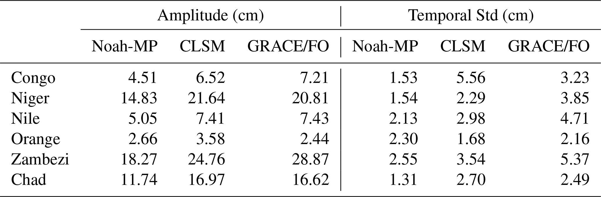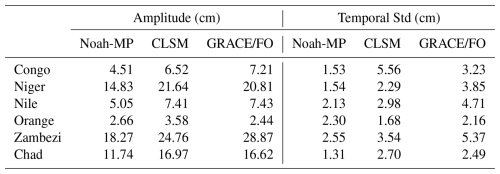 Neither model simulates surface water, which is detected by GRACE/FO satellites. However, surface water contribution to TWS is generally smaller compared to other TWS components, except in areas with large surface water bodies (Rodell and Famiglietti, 2001; Getirana et al., 2017; Deggim et al., 2021). Implications of neglecting surface water storage for the evaluation results are discussed in Sect. 3. In addition, both models do not simulate water storage changes in confined aquifers which are also detected by GRACE/FO satellites. Because snow is negligible in Africa, simulated TWS in this study is thus represented as the sum of soil moisture in the unsaturated zone, 2 m for Noah-MP and 1 m for CLSM, and groundwater storage.