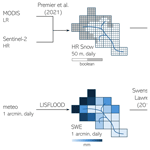 To address these limitations, we adopt the approach of Premier et al. (2021), which integrates LR and HR optical satellite observations to produce a continuous, gap-free daily binary snow dataset (snow/snow-free) at HR (50 m). The method combines (i) LR daily SCF products (e.g., MODIS) and (ii) HR Sentinel-2 snow maps within an iterative gap-filling and downscaling framework, followed by a machine learning correction step. This framework relies on the assumption that inter-annual snow patterns are strongly influenced by local topography (elevation, slope, aspect) and meteorological conditions, resulting in recurrent spatial patterns of snow accumulation and ablation. By leveraging a long archive of HR acquisitions, the method reconstructs daily HR snow maps while correcting for known LR limitations, including errors from grain size variability, solar zenith angle, viewing geometry, and atmospheric effects. Details about the performance of the algorithm can be found in the original work.
