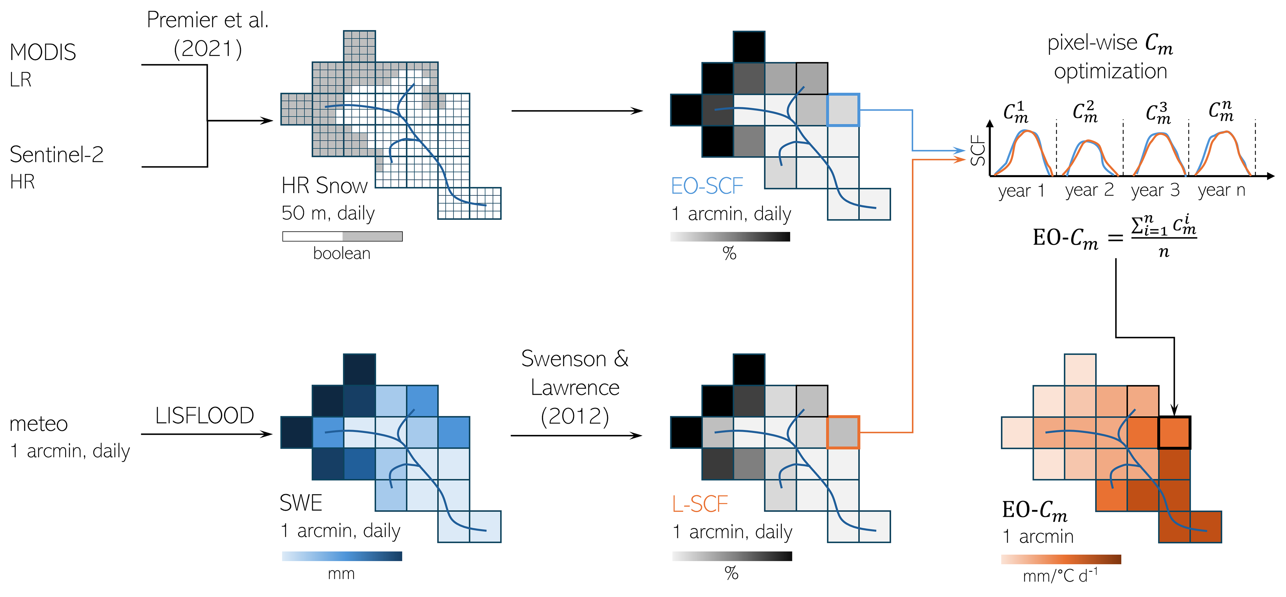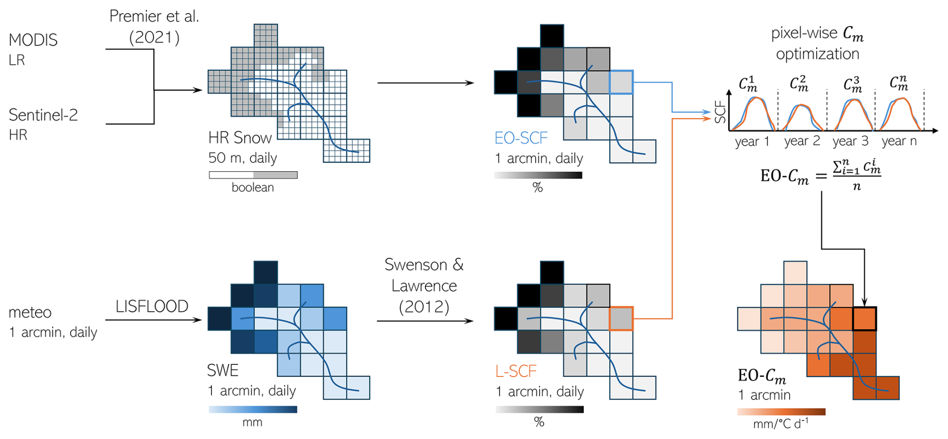 The pixel-based optimization minimizes the error between LISFLOOD-simulated SCF (L-SCF) and a novel, high resolution (50 m, daily) gap-filled EO-SCF (Premier et al., 2021). To facilitate this, we implement a parameterization to convert snow water equivalent (SWE) simulated by LISFLOOD to SCF (Swenson and Lawrence, 2012). This high-resolution approach represents a significant advancement over previous studies using lower-resolution products like MODIS (500 m) (Thirel et al., 2012; Pistocchi et al., 2017). Finally, we re-run LISFLOOD with the newly estimated snowmelt coefficient (EO-Cm), keeping all other settings consistent with the standard setup to specifically assess the effects of a more consistent representation of the snow module on hydrological response.