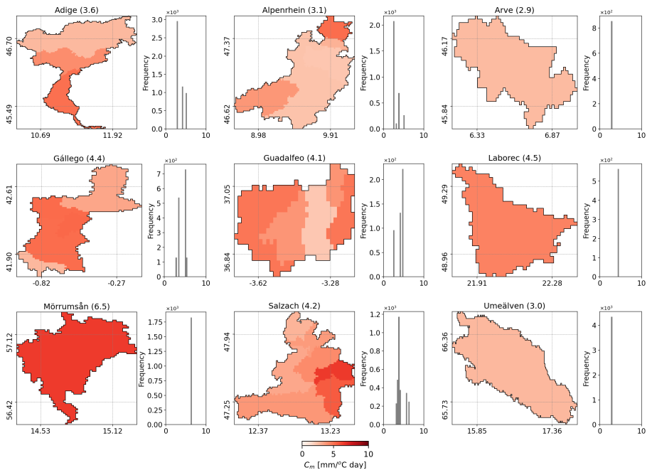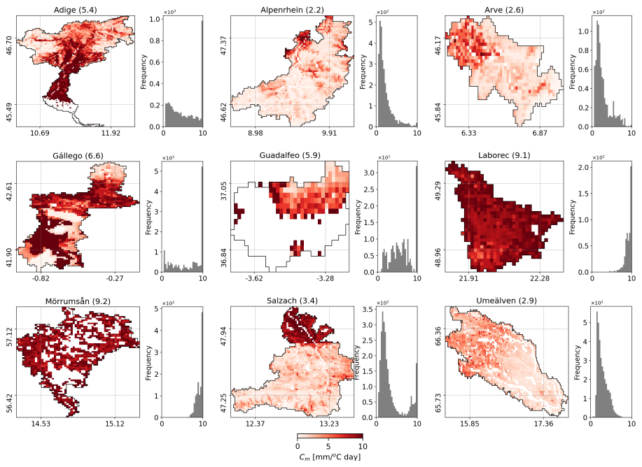 Figure 4Snowmelt coefficients resulting from optimization based calibration against earth observation SCF (EO-Cm) for the nine selected basins. The corresponding histograms are also included. Missing values (in white) correspond to masked areas, such as water bodies, or pixels that never experienced snow for the analysed period. Average values are reported within brackets.