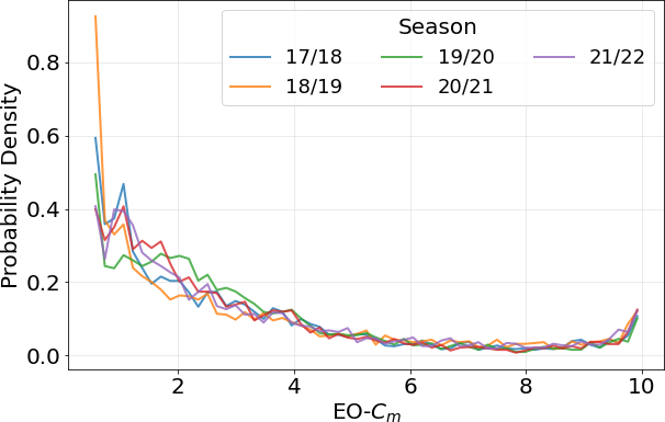 Figure 5Probability density of the EO snowmelt coefficient for the Adige basin during the calibration season. Values of 10 are excluded for better visualization.