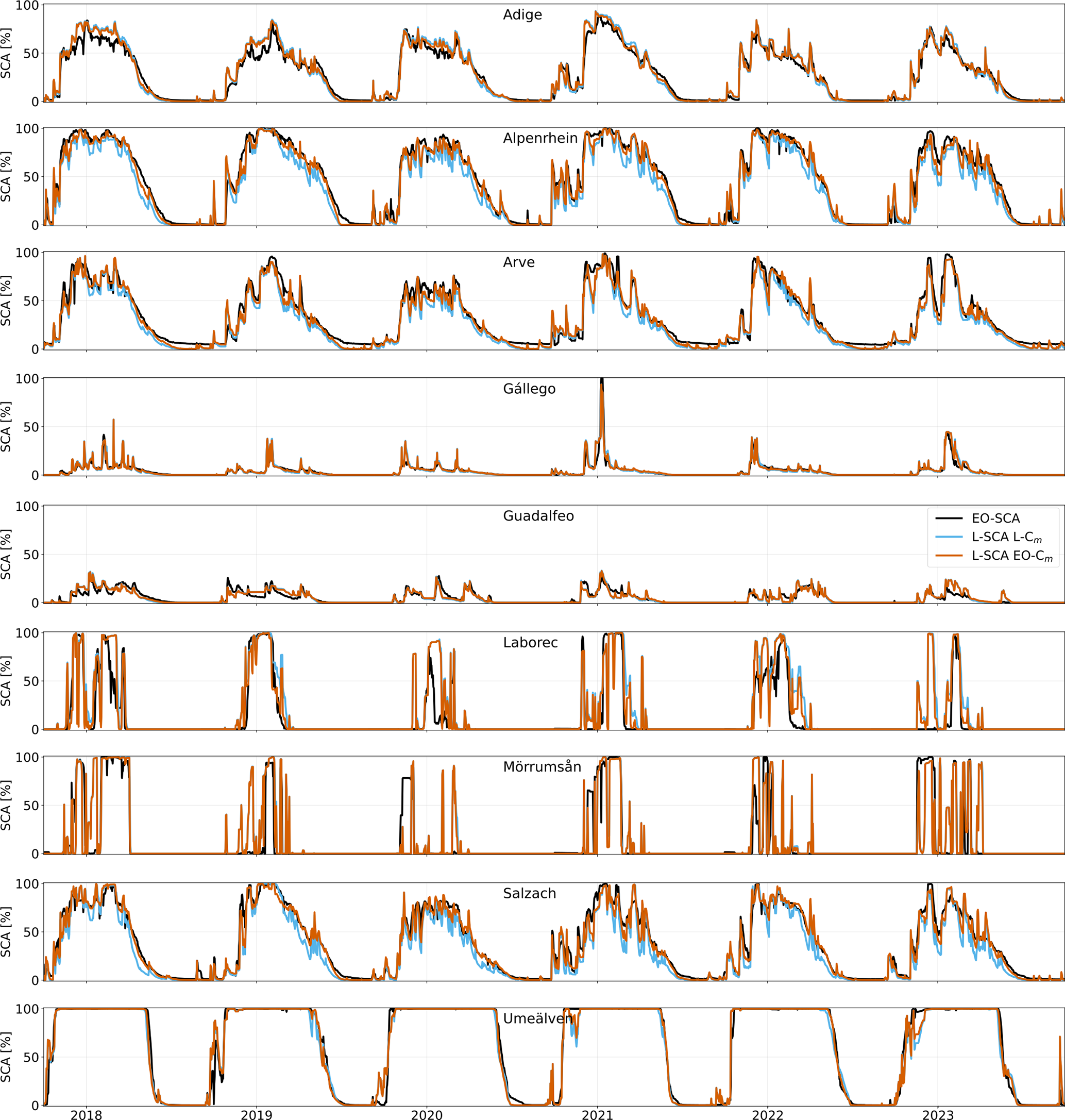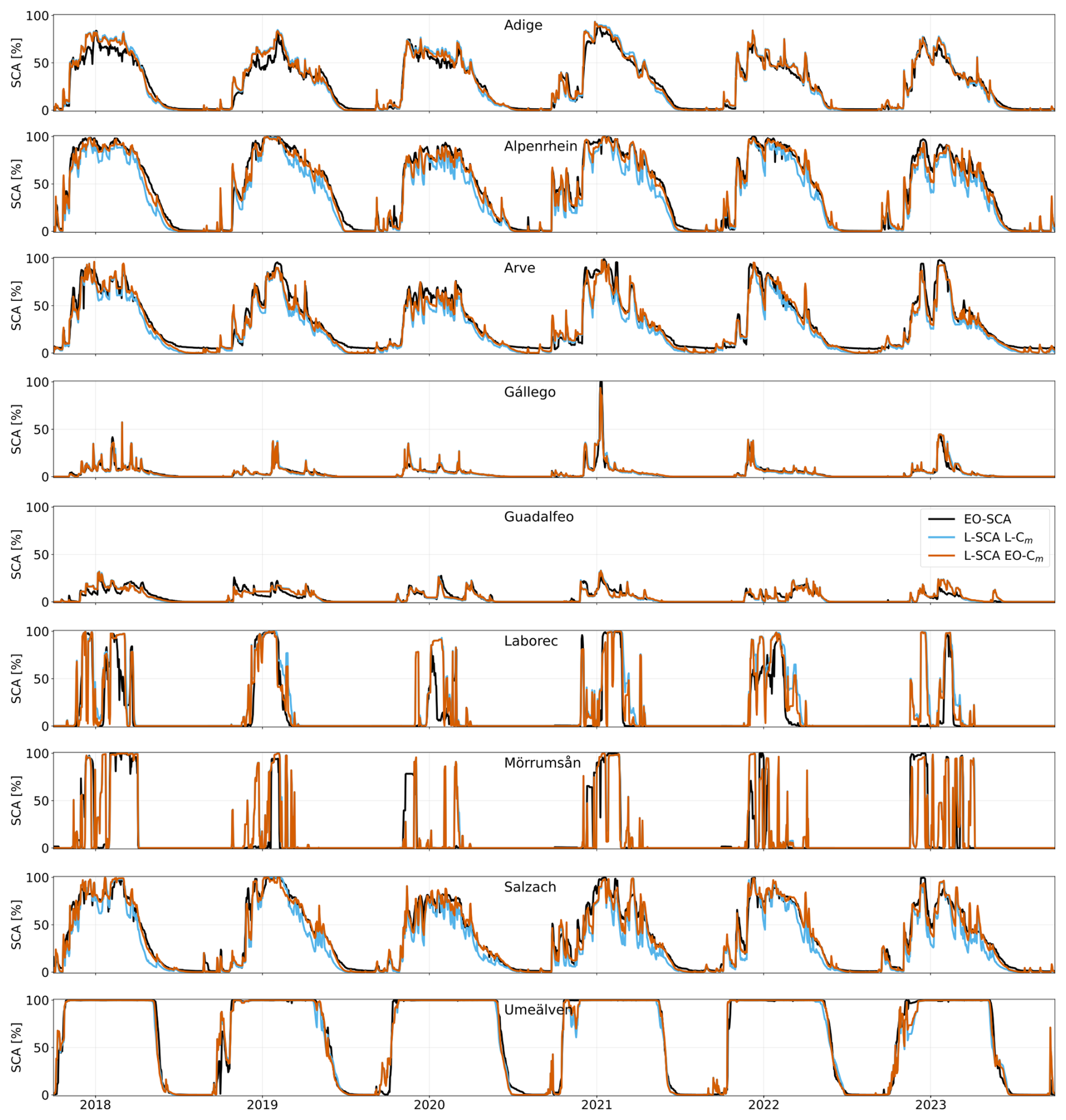 Figure 6SCA trends for the nine river basins. In black, the observed EO-SCA, in cyan the LISFLOOD simulated SCA using the standard EFAS5 snowmelt coefficient (L-Cm), and in orange the LISFLOOD simulated SCA using the EO-optimized coefficient (EO-Cm).