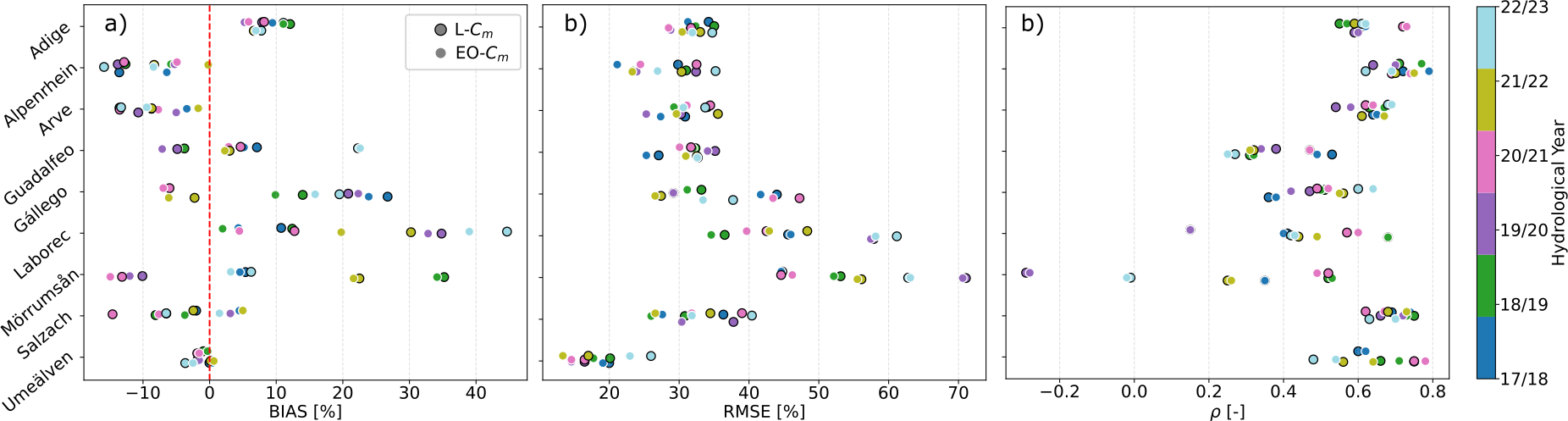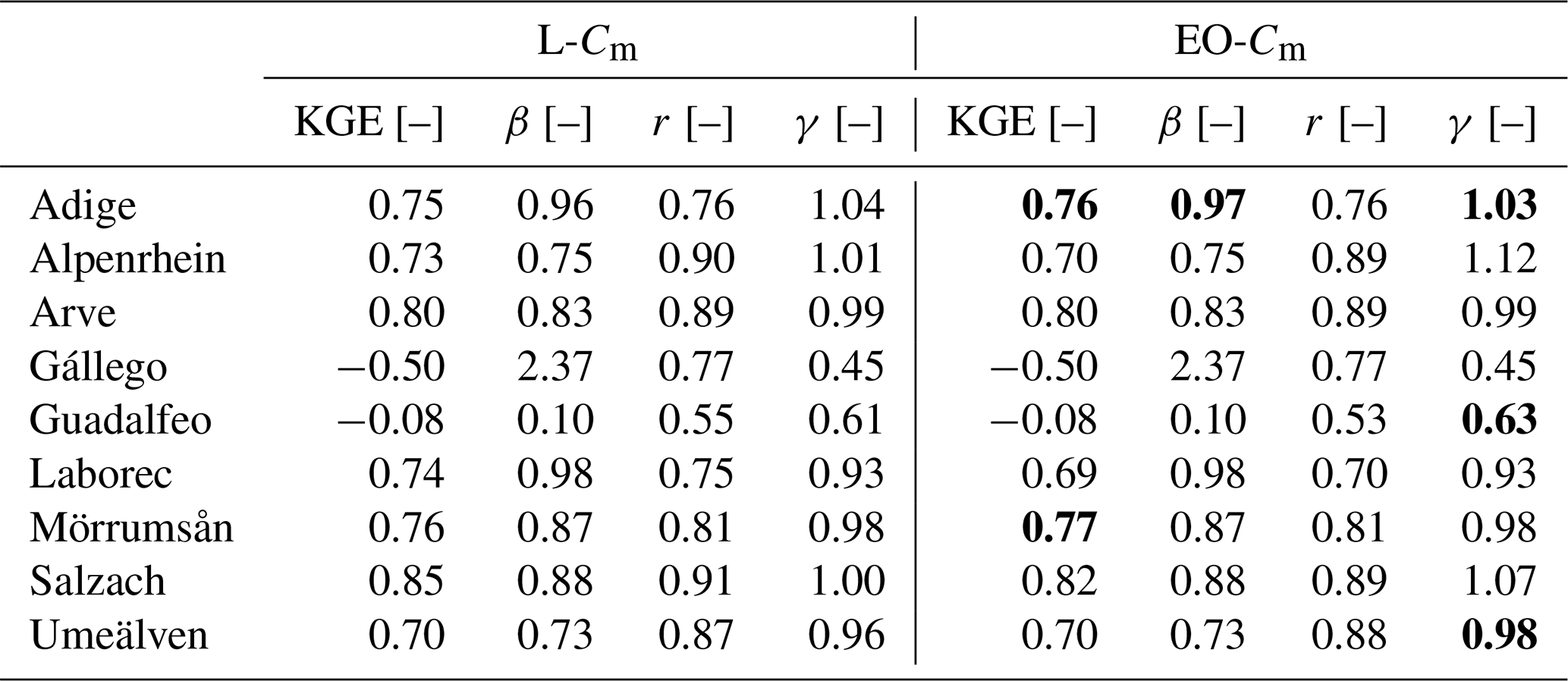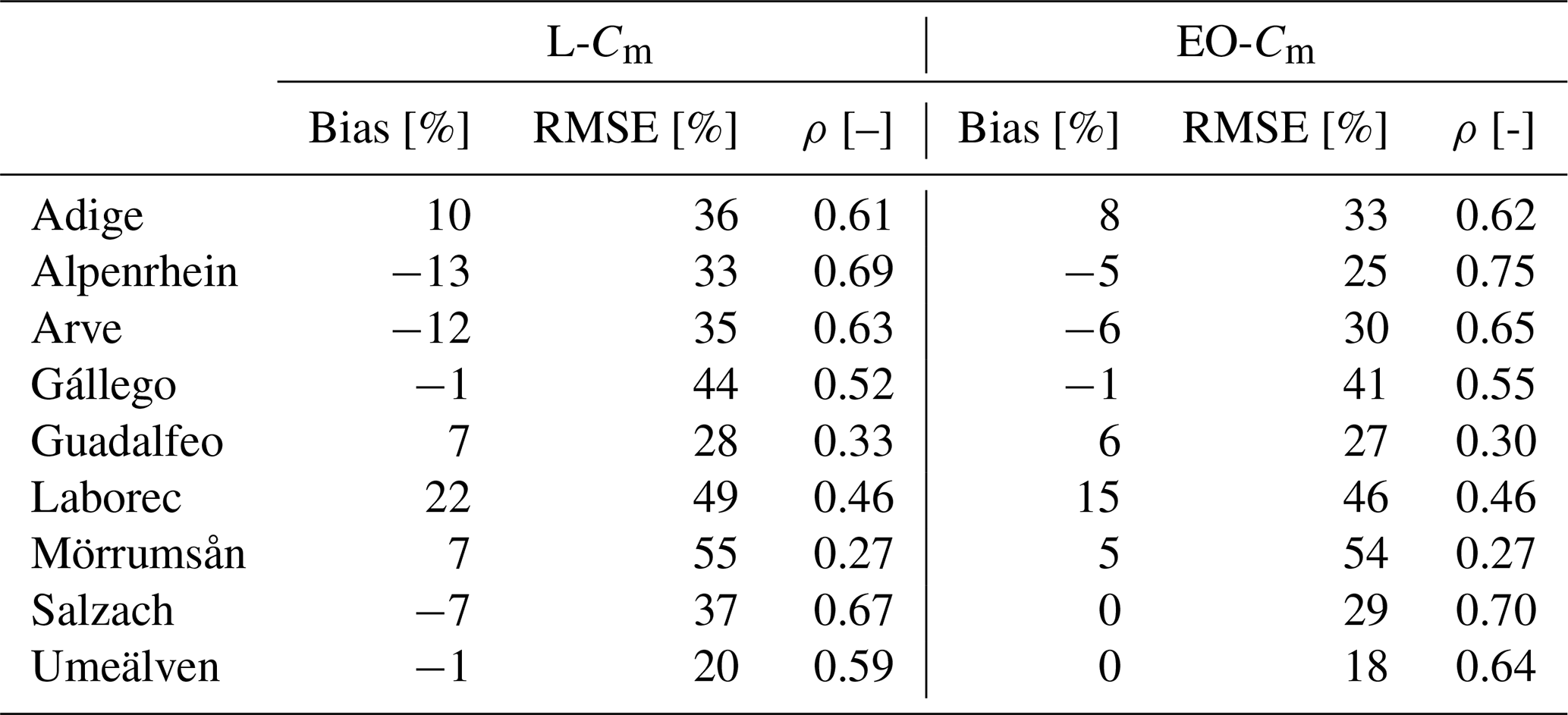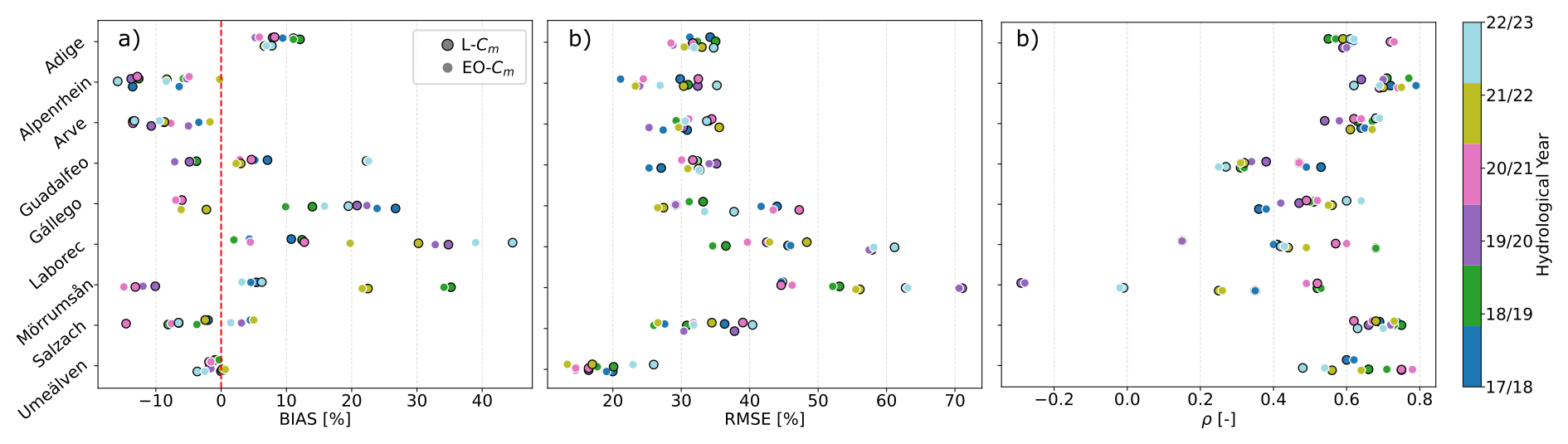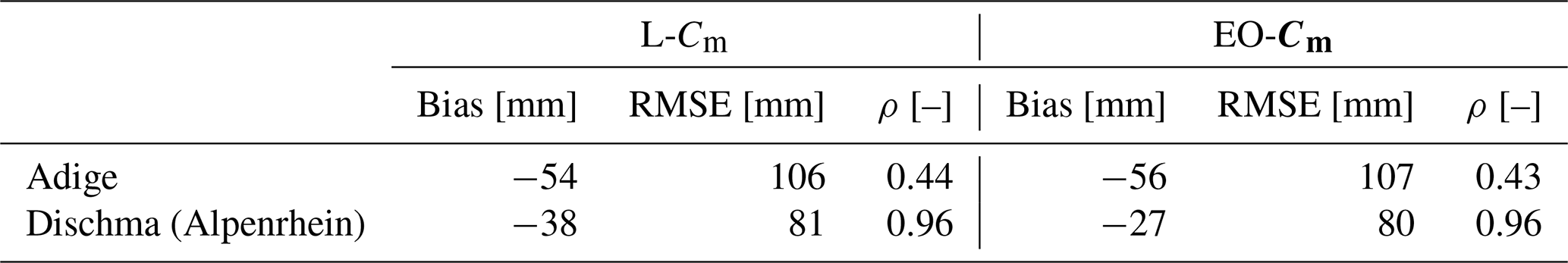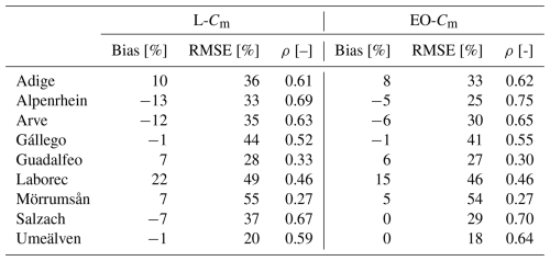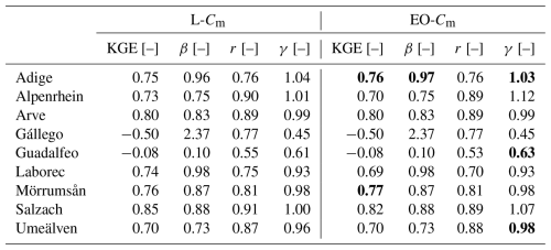 A SWE intercomparison is performed for basins where a reference dataset is available. To complete the assessment, we evaluate how the hydrological response changes when using EO-Cm. Specifically, we replace L-Cm with EO-Cm and run the LISFLOOD model from 1990 to 2023, including two warm-up years (1990–1991). The remaining 13 model parameters are kept unchanged, allowing us to isolate the impact of Cm on river discharge and assess whether the current EFAS5 setup can realistically capture snow accumulation and melt dynamics in the selected catchments. These results are reported in Sect. 4.3.