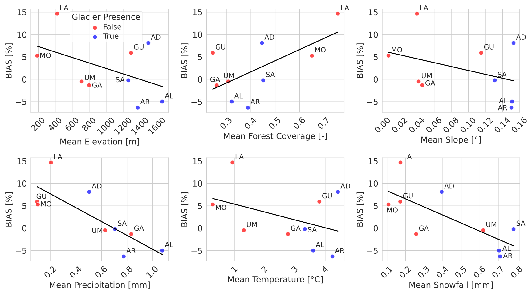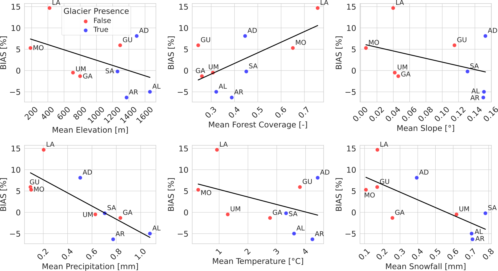 Figure 8Bias of SCF obtained using EO-Cm in relation to selected physiographic and climatic features. Basin identifiers are indicated by their initial letters. Glacierized basins are marked in blue, and non-glacierized basins in red.