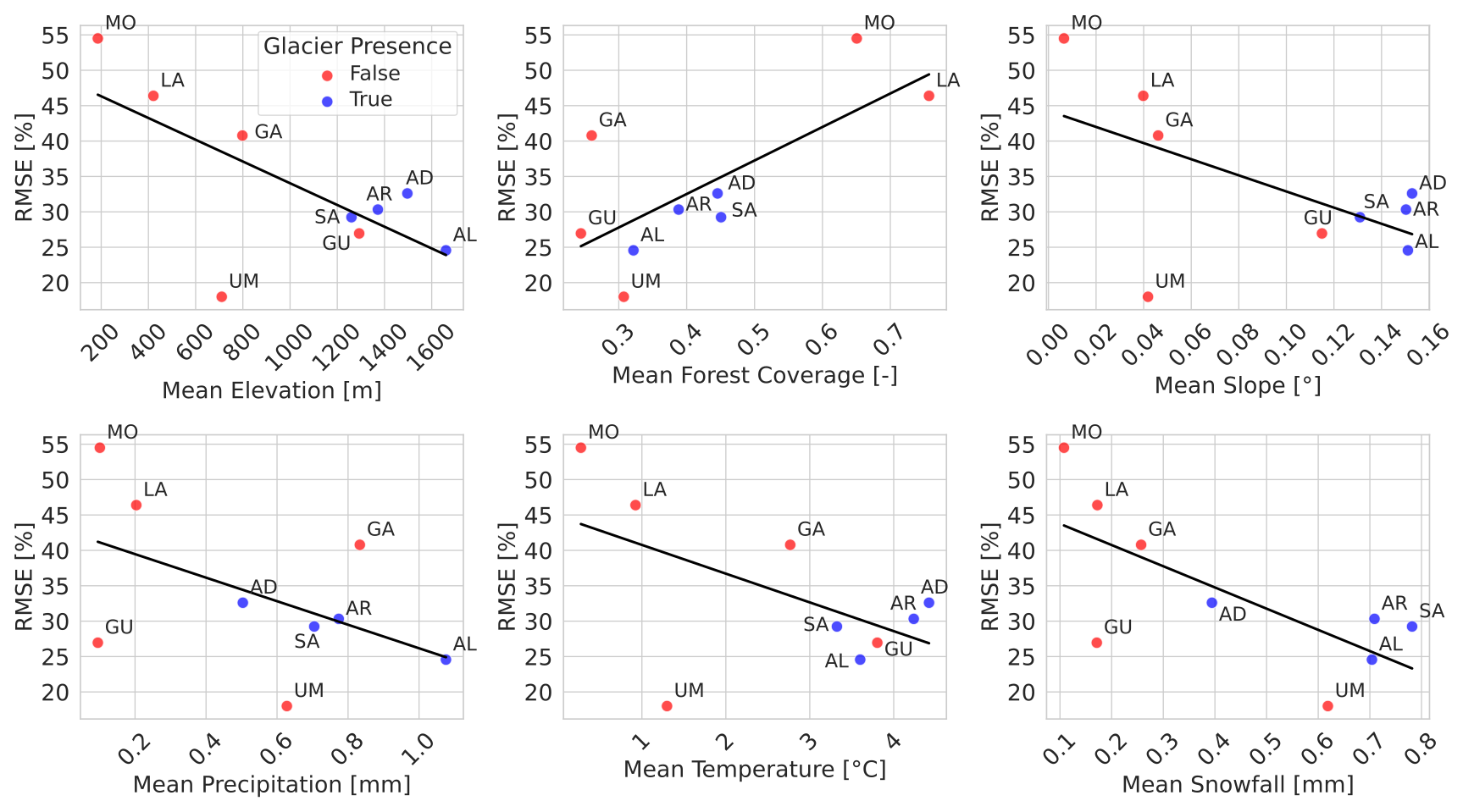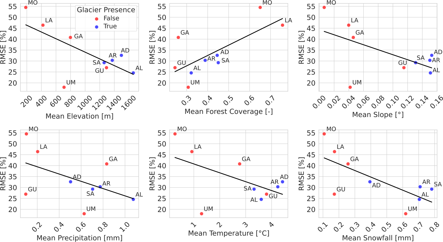 Figure 9Root mean square error of SCF obtained using EO-Cm in relation to selected physiographic and climatic features. Basin identifiers are indicated by their initial letters. Glacierized basins are marked in blue, and non-glacierized basins in red.