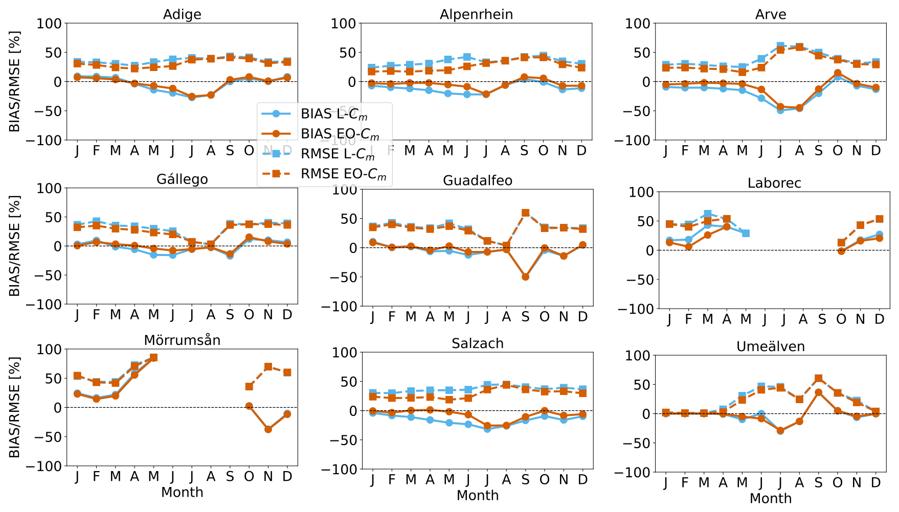 It is also interesting to analyse the monthly evolution of bias and RMSE, as shown in Fig. 10. Overall, model performance tends to deteriorate during the summer months across all basins, reflecting the snow depletion phase. This reduction in performance is partly driven by the smaller number of snow-covered pixels considered (snow-free pixels are excluded), which are often characterized by fractional snow cover and thus more prone to errors. Nevertheless, despite this seasonal decline, we generally observe an improvement when applying EO-Cm.