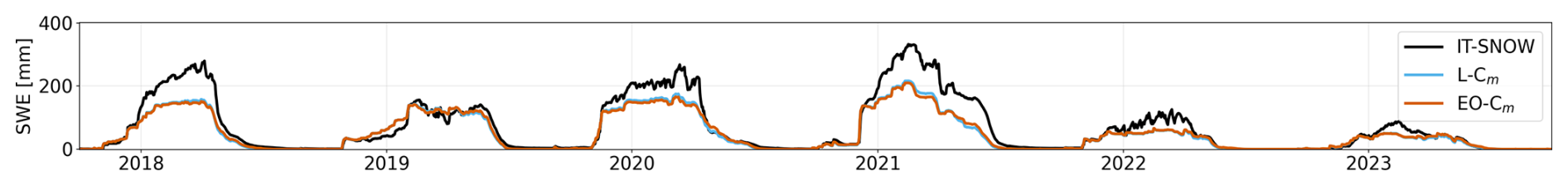 Figure 11SWE time-series for the Adige river basin. In black the simulation from IT-SNOW, in cyan the LISFLOOD simulation using the standard EFAS5 snowmelt coefficient (L-Cm), and in orange the LISFLOOD simulation using the EO-optimized coefficient (EO-Cm).