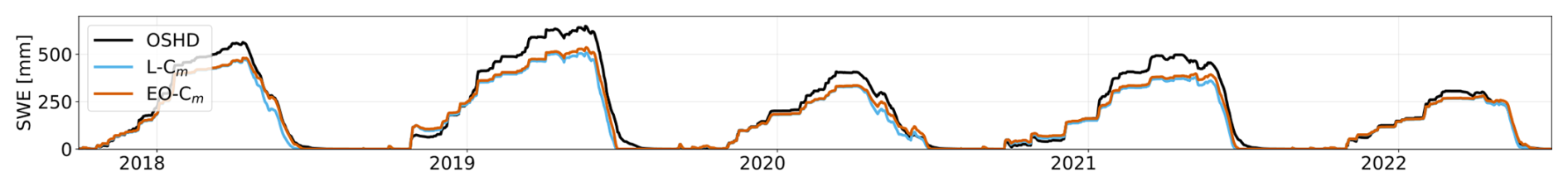 The results confirm a generally good agreement but also highlight LISFLOOD’s tendency to underestimate SWE compared to the other models in both basins. These differences are most likely linked to discrepancies in precipitation input data. Notably, IT-SNOW assimilates snow height measurements, which can enhance the accuracy of accumulation estimates. Discrepancies in the input forcings might explain the general low correlation for the Adige (), while for Dischma we obtain a very high correlation (0.96) both previous and after Cm replacement. Notably, especially for the Dischma Valley the depletion curve is better captured when using EO-Cm. However, for both basins we obtain comparable or slightly improved metrics aligning with expectations based on the SCA comparison. Interestingly, we did not observe worse performance in representing different conditions, such as snow drought events, which appear to be reasonably well reproduced by both the standard and EO-Cm. This is particularly evident in the Adige basin during the 2021/22 and 2022/23 seasons. It should be noted that this analysis is not exhaustive, as it relies solely on intercomparison with other models with inherent limitations stemming from model parameterizations and the quality of forcing inputs. Therefore, the analysis lacks validation against reference data.
