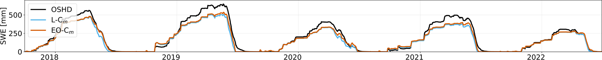 Figure 12SWE time-series for the Dischma (Alpenrhein). In black the simulation from OSHD, in cyan the LISFLOOD simulation using the standard EFAS5 snowmelt coefficient (L-Cm), and in orange the LISFLOOD simulation using the EO-optimized coefficient (EO-Cm).