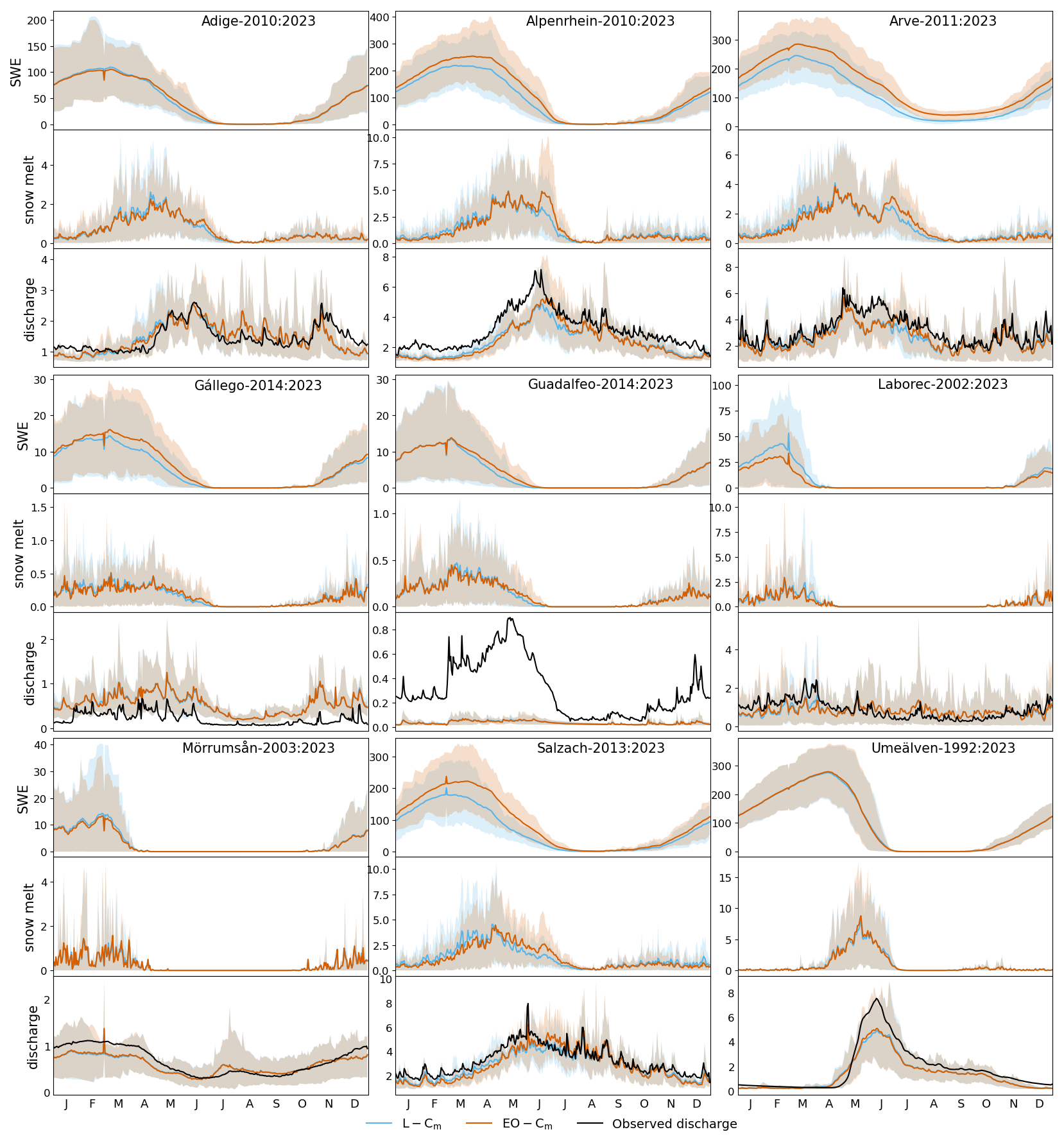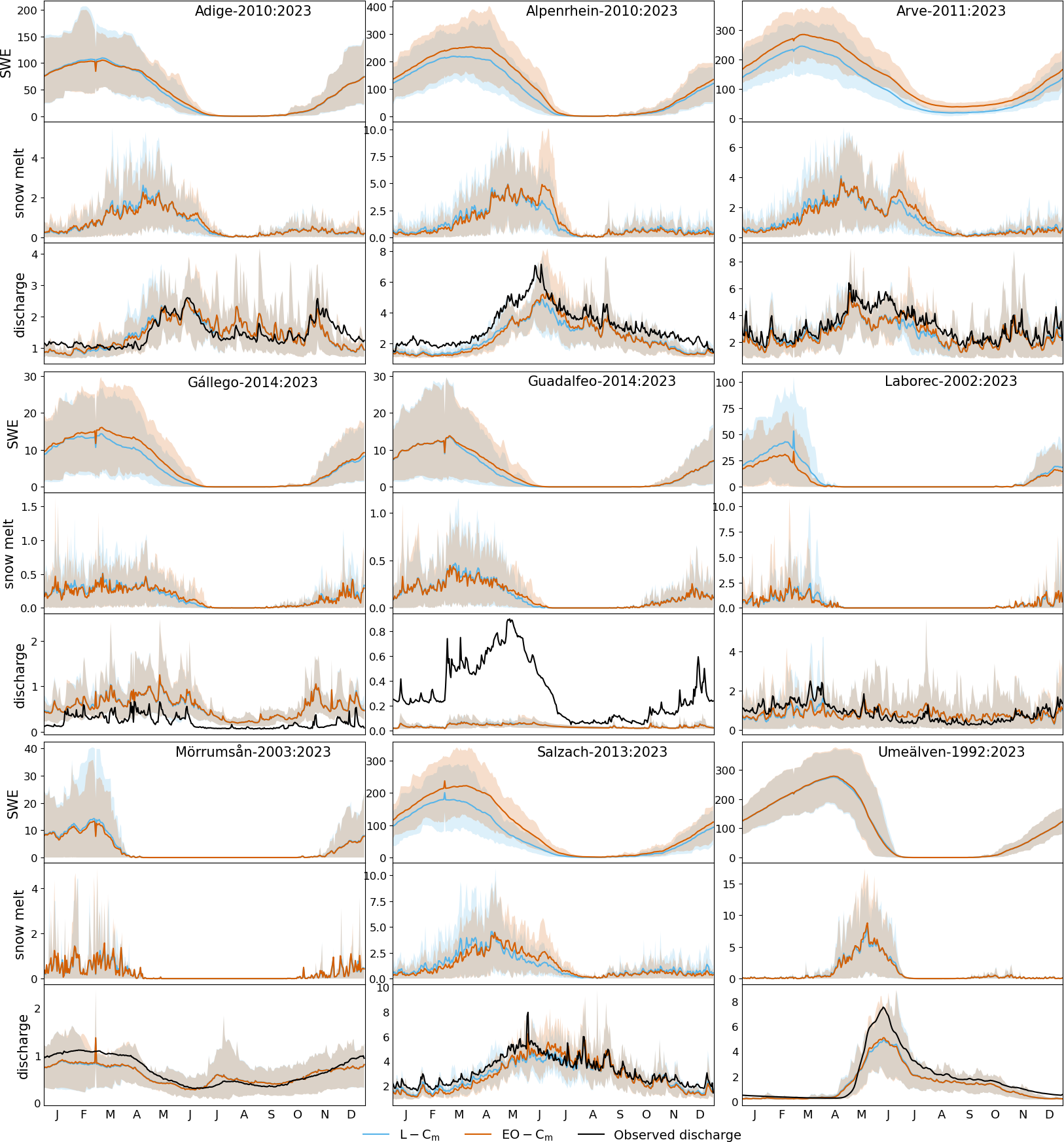 In this section, we evaluate the hydrological response to post-replacement of the snowmelt coefficient (EO-Cm), with results compared against benchmark simulations using the standard L-Cm. Note that, as explained in Sect. 2.2.1, all the other parameters are kept unchanged, following EFAS5. Results are shown as daily averages calculated only for periods with available observations (Fig. 13). Reported variables include SWE, snowmelt, and discharge, all expressed in mm d−1. Dashed lines in the figure denote the 10th and 90th percentiles of the time series, indicating variability in the modelled hydrological response.