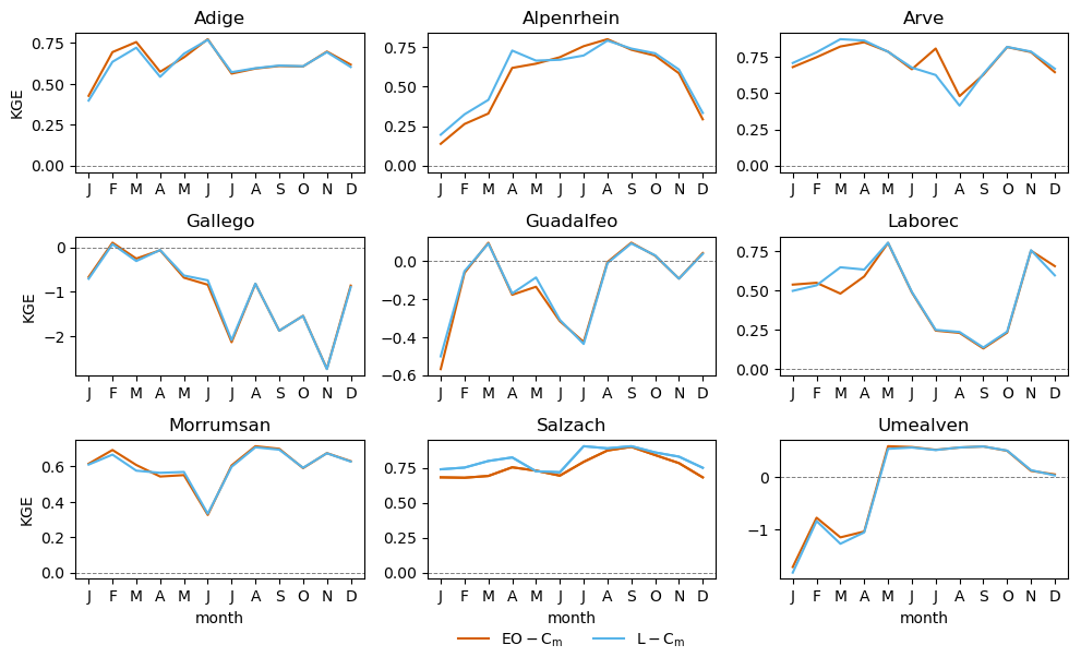 We compare the mean annual hydrographs of the two simulations for periods with observations to check if changes in SWE and snowmelt are reflected in the simulated discharge. In addition, we calculate the Kling-Gupta Efficiency (KGE) both over the entire period and aggregated by month, using daily simulated and observed river discharge data. This allows us to evaluate the overall performance of the simulations as well as their performance across different sections of the annual hydrograph, with particular attention to potential increases or decreases in performance during the snowmelt season. Finally we evaluate the spatial similarity of river discharge at pixel level to identify main difference between EO-Cm and L-Cm simulations upstream of the discharge station. The analysis focuses on upstream catchment areas larger than 100 km2 to exclude very small headwater sections that may introduce noise in spatial comparisons. To do so, we extract daily river discharge time series from both model outputs and apply min-max normalization for each grid cell, standardizing discharge values across different magnitudes and catchments. We then compute the Euclidean distance between the normalized discharge values of the two models at each grid cell, quantifying the absolute dissimilarity in flow dynamics over time. The Normalized Euclidean Distance (NED) values range from 0 to infinity, where a value of 0 indicates that the two time series are identical or highly similar, and larger values signify greater dissimilarity between the time series. These results are reported in Sect. 4.4.