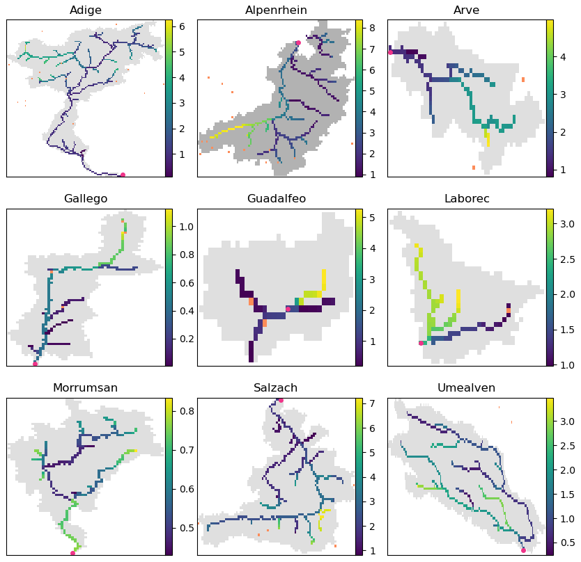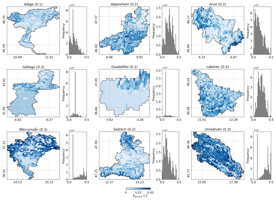 We test this approach in nine European watersheds selected to represent diverse topographical and climatic conditions, including major mountain ranges and a wide range of latitudes. These basins also feature different land cover types, from rugged mountainous terrain to flat, forested areas, offering a comprehensive foundation for evaluating the model’s performance in diverse environmental contexts. Although demonstrated here for LISFLOOD, the approach is general and transferable to other large-scale hydrological models.