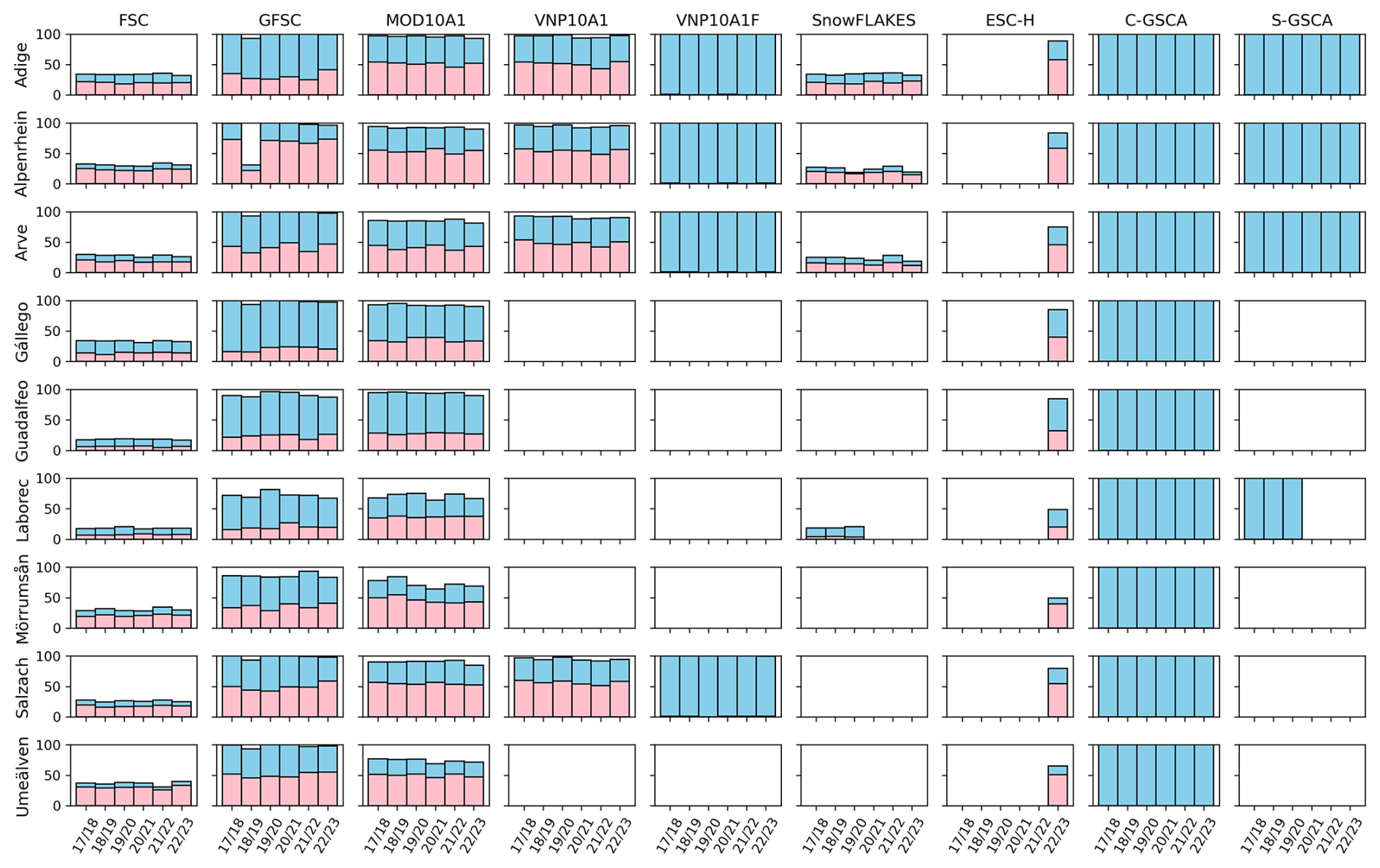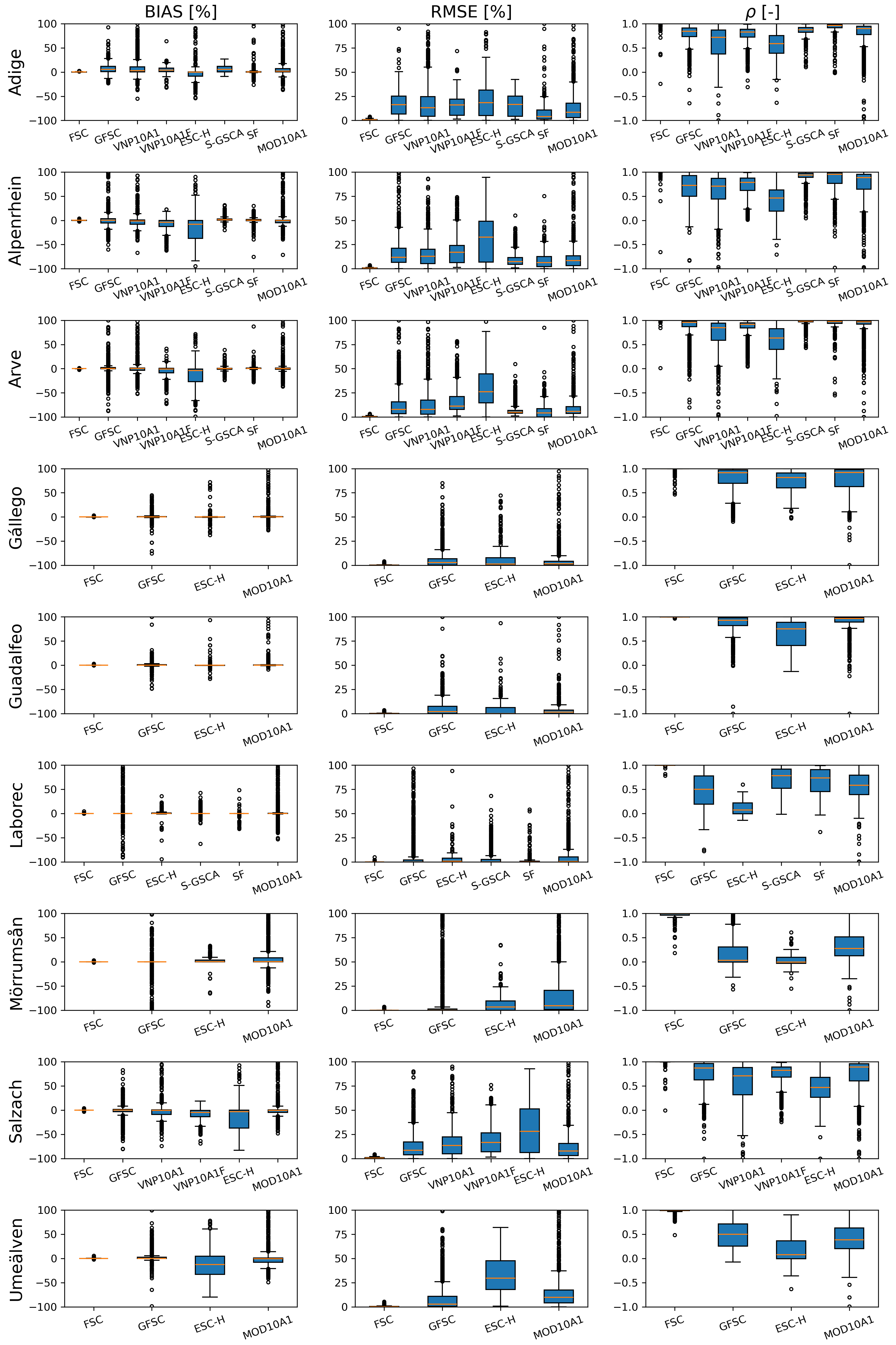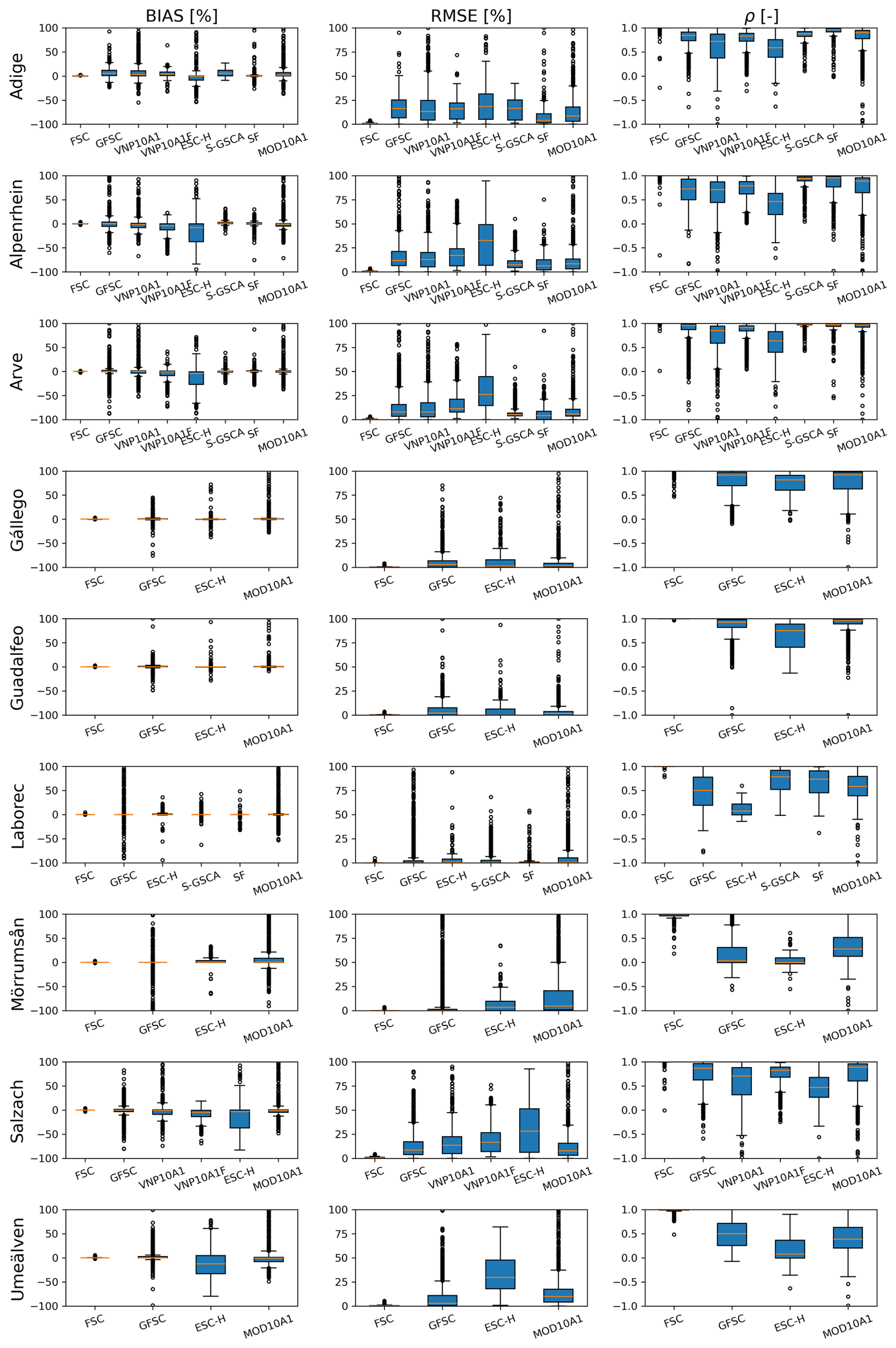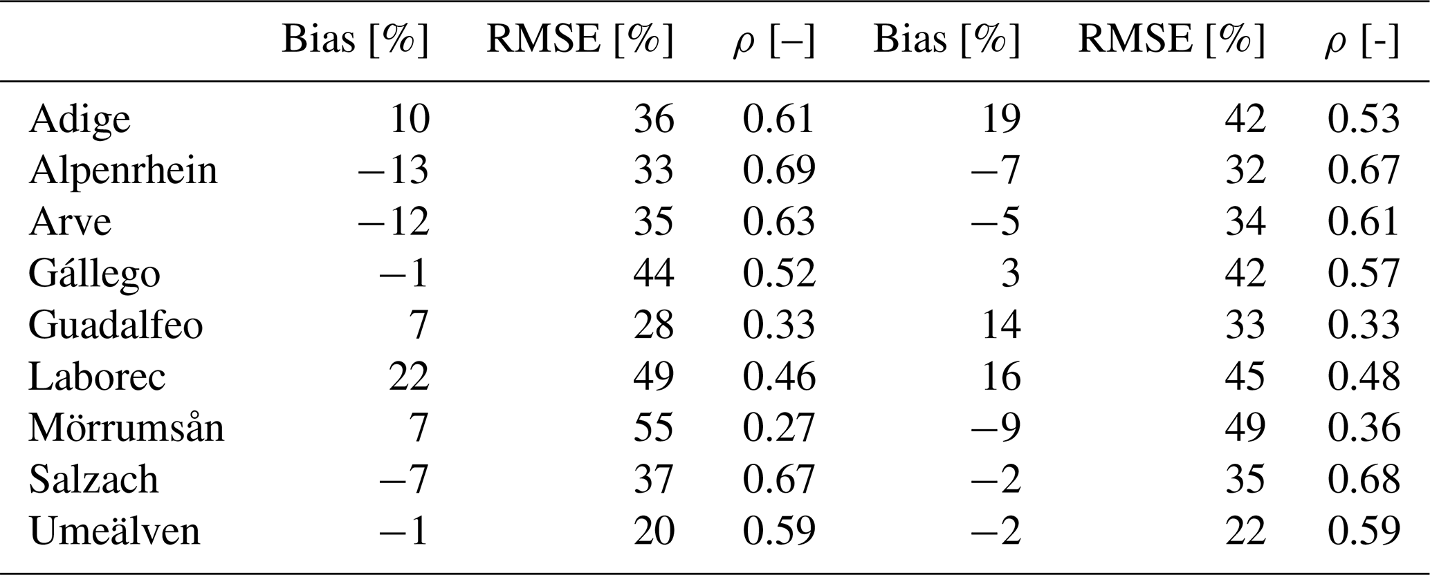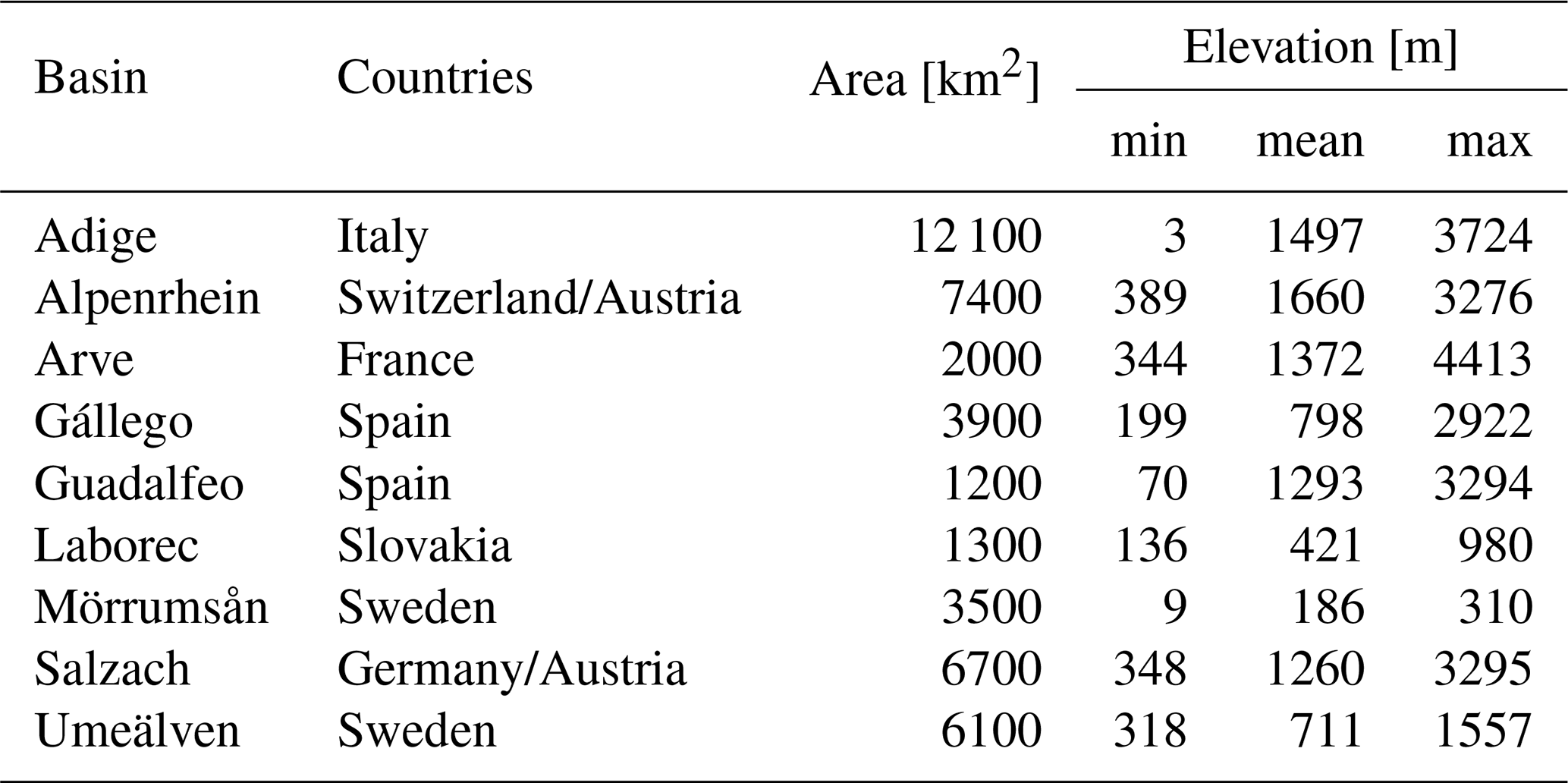 For example, Mörrumsån (Sweden) and Laborec (Slovakia) are relatively flat with brief, intermittent snow periods, with Laborec also having significant forest cover. Umeälven (Sweden), though similarly flat, experiences prolonged snow cover lasting several months due to its high latitude. In contrast, the remaining basins exhibit a more typical alpine snowpack. Some basins (Adige, Alpenrhein, Arve, and Salzach) contain glaciers, though glacier-covered areas are generally small – less than 1 % of the total area (approximately 0.9 % for Adige and Salzach, 0.6 % for Alpenrhein) – with the exception of Arve, where glacierized areas account for about 5 % of the basin. Two basins in Spain, Guadalfeo and Gállego, are strongly influenced by anthropogenic activities, providing an opportunity to assess model performance under different basin characteristics.
