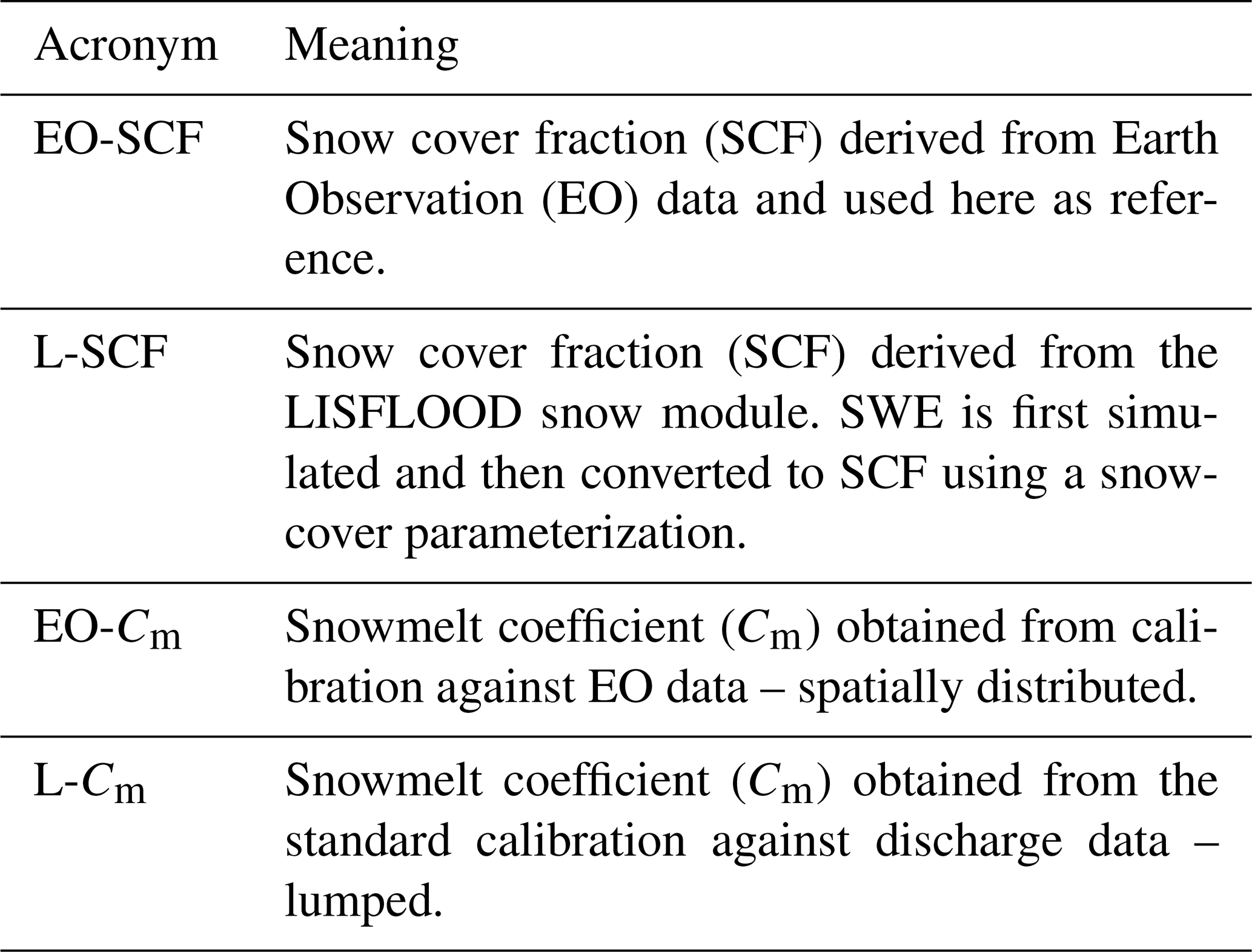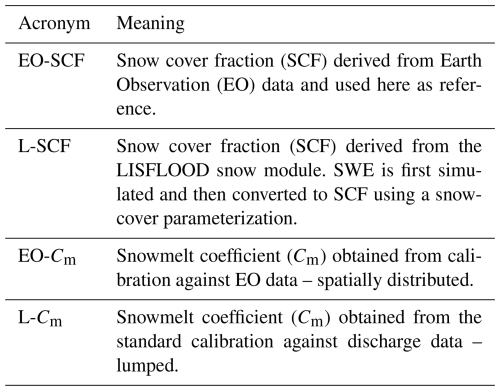 Daily high-resolution (50 m) binary snow cover data are used to derive SCF time series (hereafter EO-SCF; Sect. 2.1). In parallel, the LISFLOOD snow module (Sect. 2.2) is run to simulate SWE. A parameterization is then applied to transform SWE into modelled SCF (hereafter L-SCF; Sect. 2.3), enabling direct comparison with EO-SCF. The snowmelt coefficient (Cm) is treated as a free parameter of the snow module. We estimate Cm by minimizing the difference between L-SCF and EO-SCF through an optimization procedure (Sect. 2.4). For each year, we obtain a spatially-distributed coefficient (EO-Cm). Given the temporal stability of the obtained coefficient (see later in Sect. 4.1), a pixel-wise average over time is then computed. One season (2022/23) is excluded from calibration and used only for evaluation. In the final LISFLOOD re-run, the discharge-calibrated coefficient (L-Cm) is replaced by EO-Cm. For clarity, all acronyms used throughout the manuscript are summarized in Table 1.