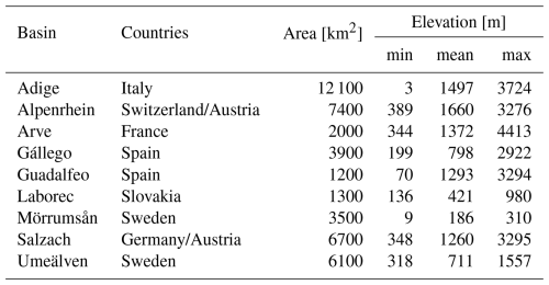 Table 2Overview of the nine hydrological catchments selected in this study, including their respective countries, area, and elevation information. The mean elevations reported here refer to the elevation from the MERIT DEM aggregated at the model resolution of 1 arcmin. Maximum and minimum elevations are calculated considering σtopo, thus representing the minimum and maximum elevations modelled.