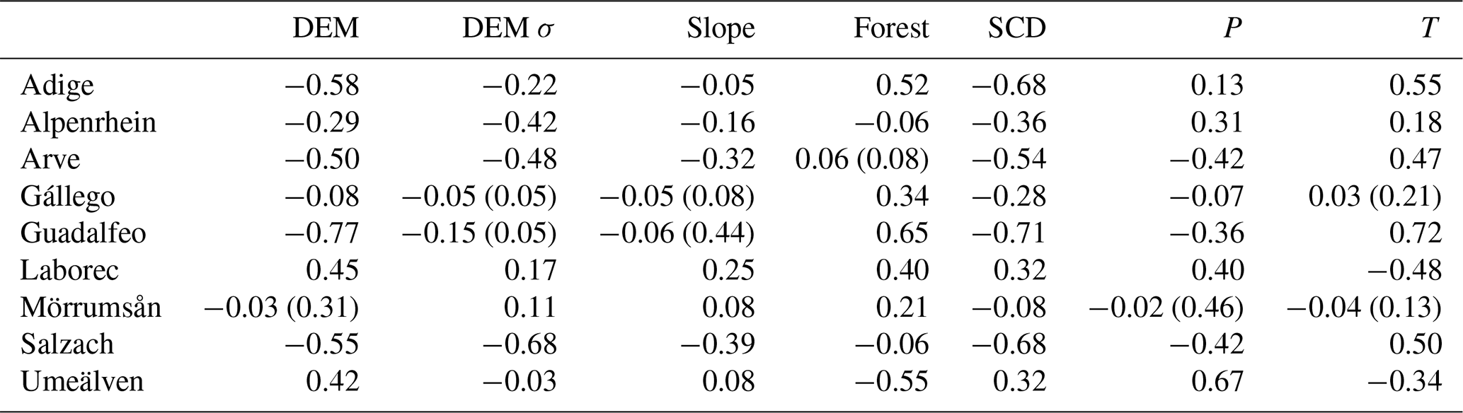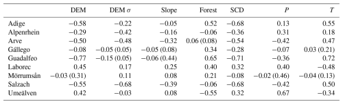 To explore whether the spatialized snowmelt coefficient calibrated at the pixel scale captures meaningful patterns, we conducted a correlation analysis with topographic, geographic, and land cover features. The motivation was that such relationships could eventually support parameterizing snowmelt based on spatial characteristics alone, thereby reducing reliance on EO data, which are often labor-intensive to process. Table 3 reports the Pearson correlation coefficients between EO-Cm and several variables: elevation (DEM), elevation variability (DEM σ), slope, forest cover, mean snow cover duration (SCD), as well as mean precipitation (P) and temperature (T), averaged over the six analyzed hydrological seasons. However, the results indicate that no strong correlations emerge from this analysis. The most influential feature appears to be elevation, which exhibits a negative correlation in the Adige, Arve, Salzach, and Guadalfeo river basins. This indicates that lower values of EO-Cm are estimated for higher elevations, meaning snow persists longer at higher elevations, as expected. For the Laborec and Umeälven basins, which are relatively flat, the correlation with elevation becomes positive. The correlation with mean snow cover duration also aligns with the findings for elevation, confirming that snow lasts longer at higher elevations. The observed correlation, together with the temporal stability of the snowmelt coefficient, may also suggest a systematic elevation-dependent bias in the precipitation forcing.