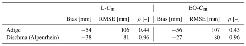 Table 5Evaluation of LISFLOOD SWE in terms of BIAS, RMSE, and correlation using IT-SNOW as the benchmark for Adige and OSHD for Dischma (Alpenrhein). The two different snowmelt coefficients L-Cm, EO-Cm were utilized. Pixels where both the target and reference SCF are snow-free are excluded from the analysis.