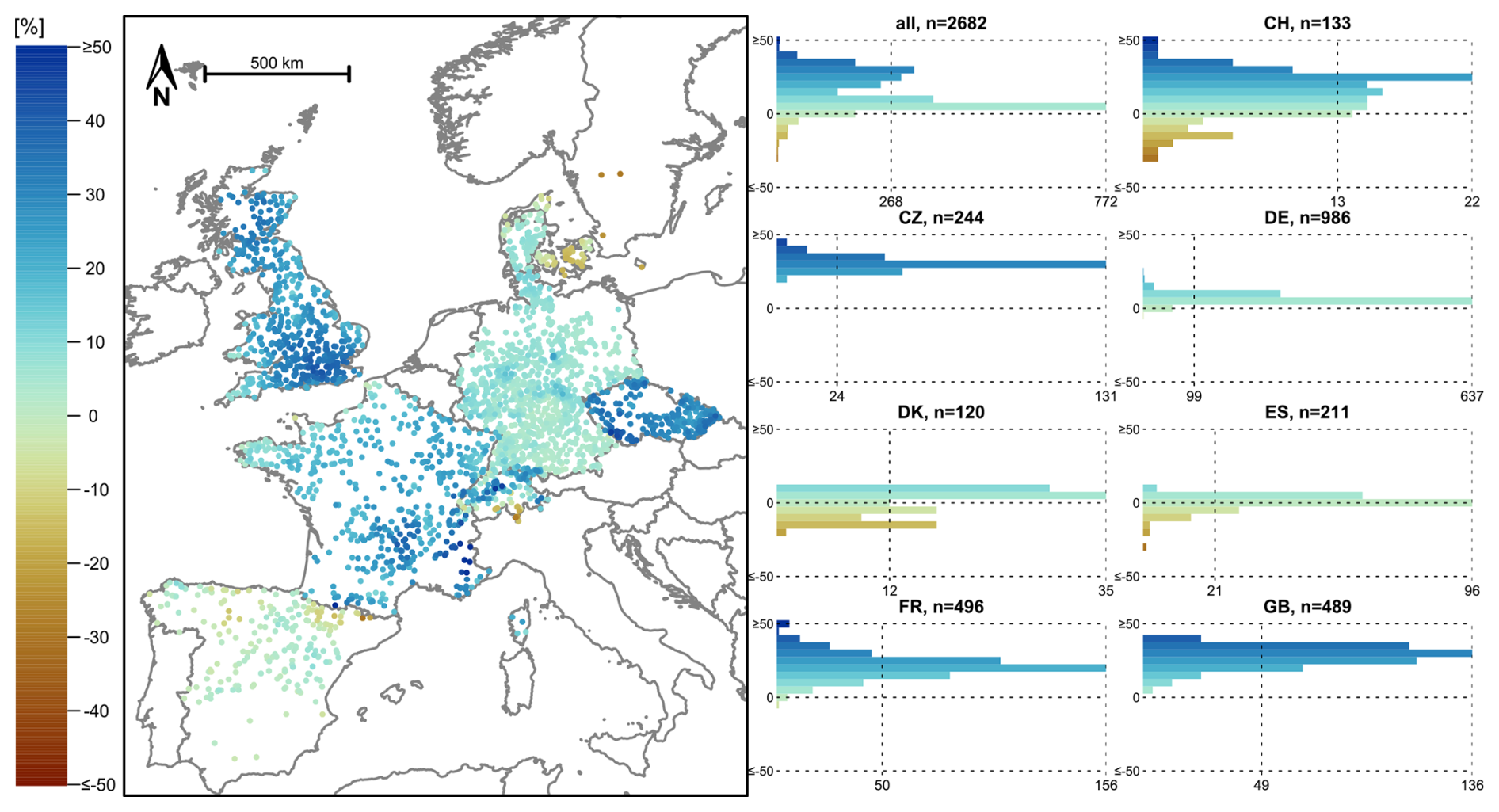 The results also indicated some interesting intercountry patterns (Fig. 6). In France, the most considerable positive differences occurred for the catchments in the eastern, more mountainous part of the country, while for Great Britain, the CAMELS data resulted in clearly higher performances in most regions but not in the area around London.