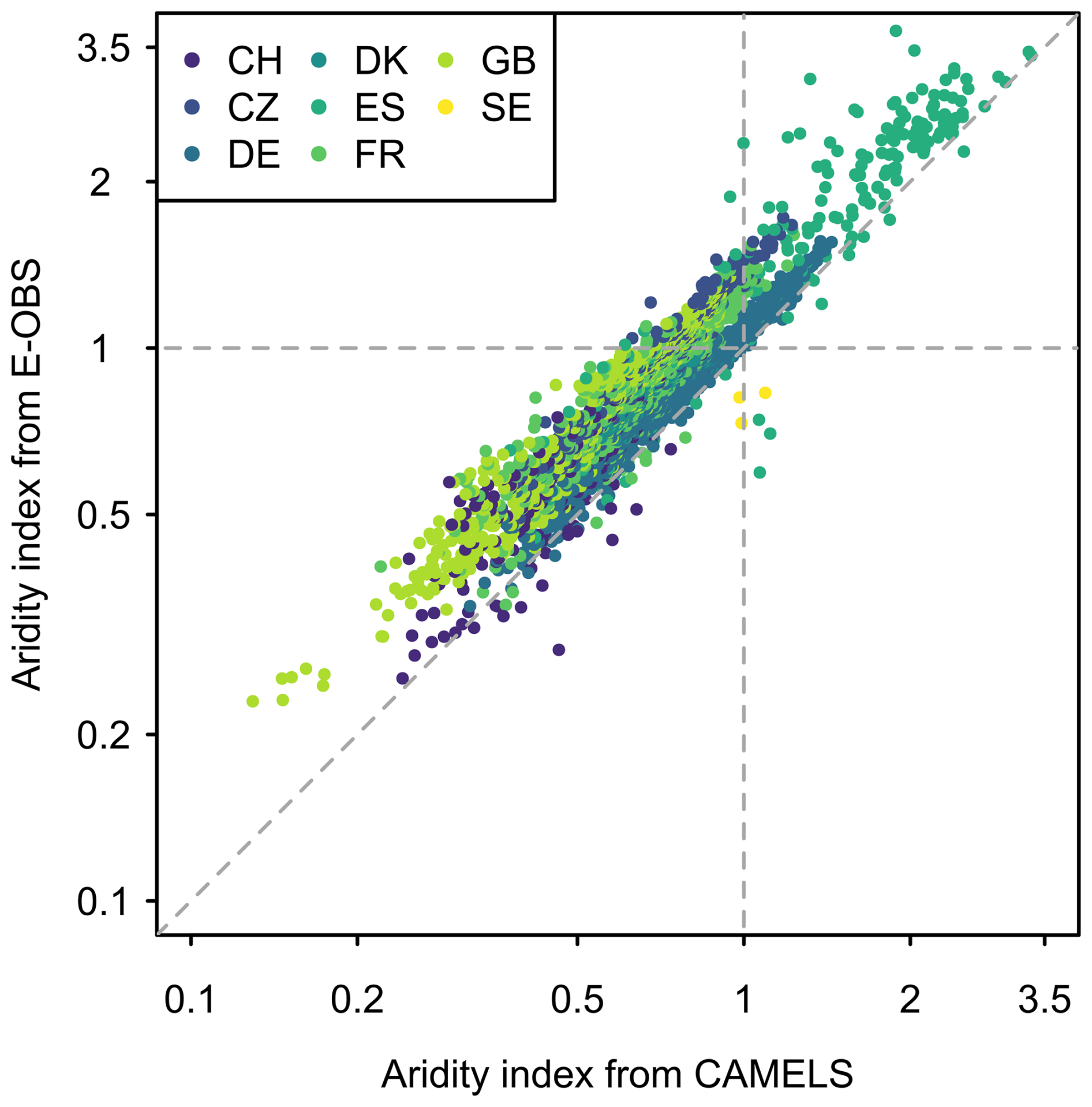 Figure 3Comparison of the aridity indices () based on the CAMELS and the E-OBS data (for a 20 yr period: 1995–2015), colour-coded by country. Note the logarithmic axes.