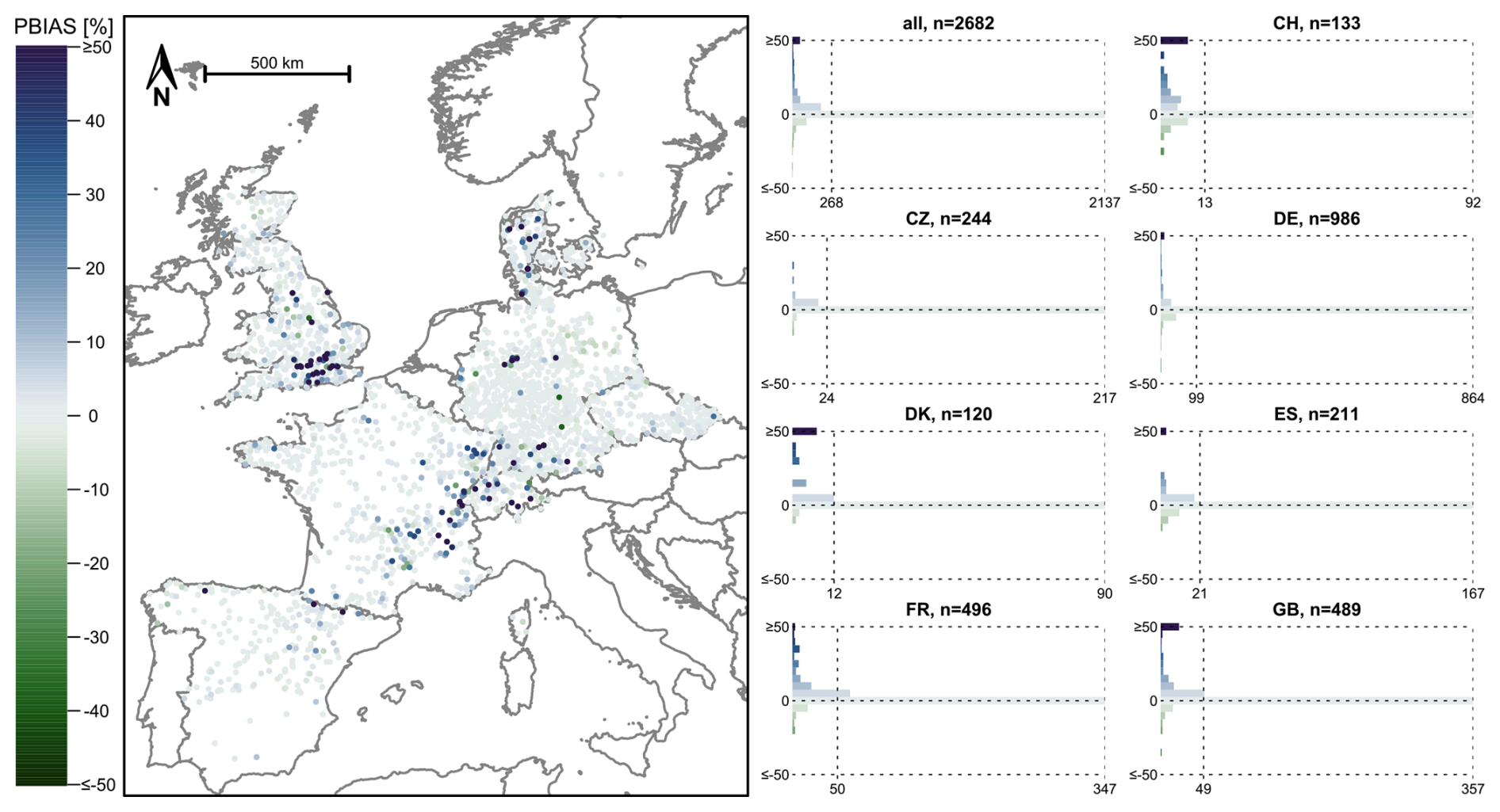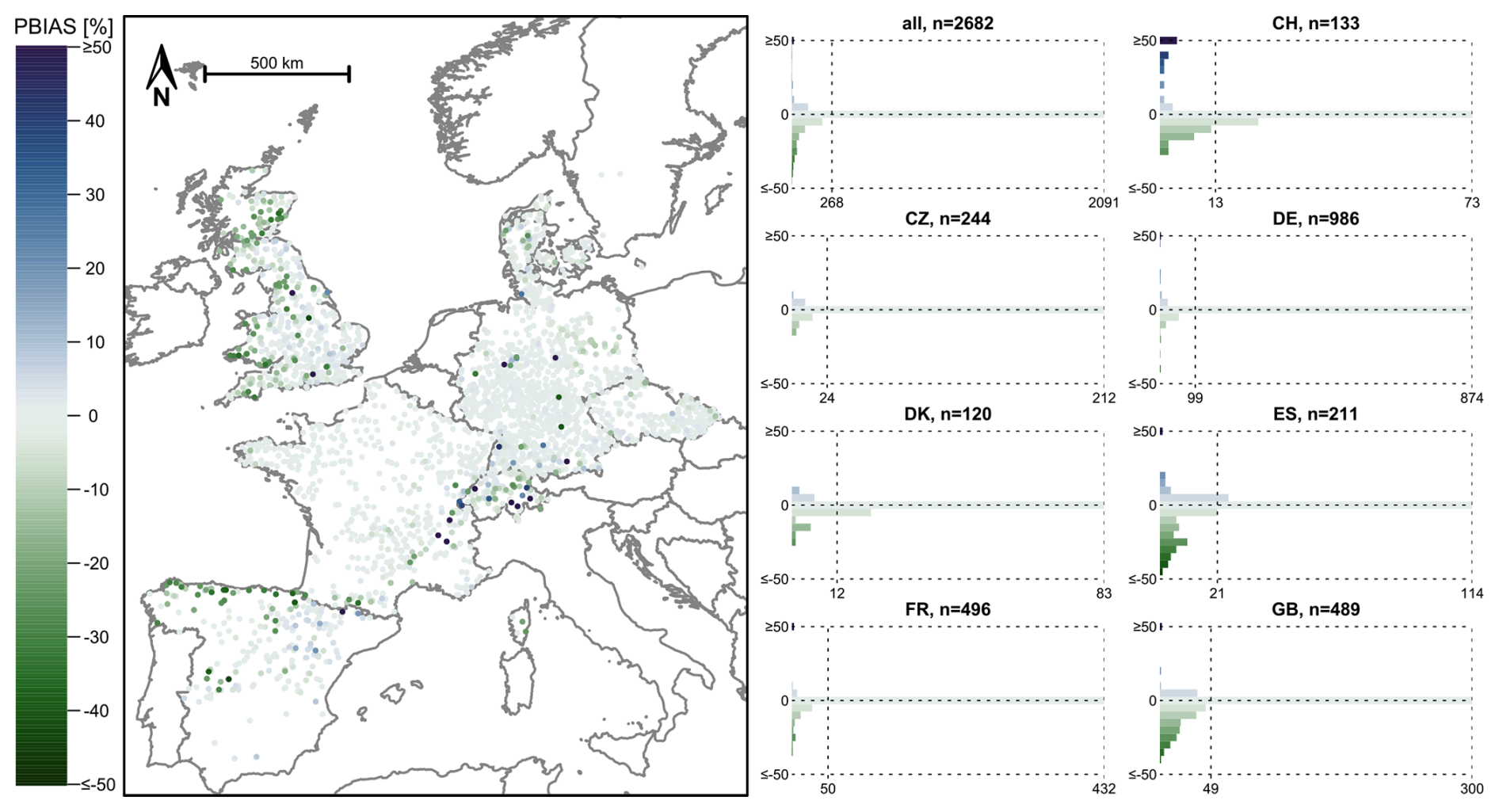 Unlike the other national datasets, the LamaH-CE dataset for Austria uses ERA5-Land as its meteorological forcing. As the comparison of E-OBS data to globally available data is a different question than the comparison to smaller-scale (national) products, we excluded the Austrian dataset from the analyses. Moreover, a previous study already highlighted several limitations of ERA5-Land as forcing for hydrological models (Clerc-Schwarzenbach et al., 2024).