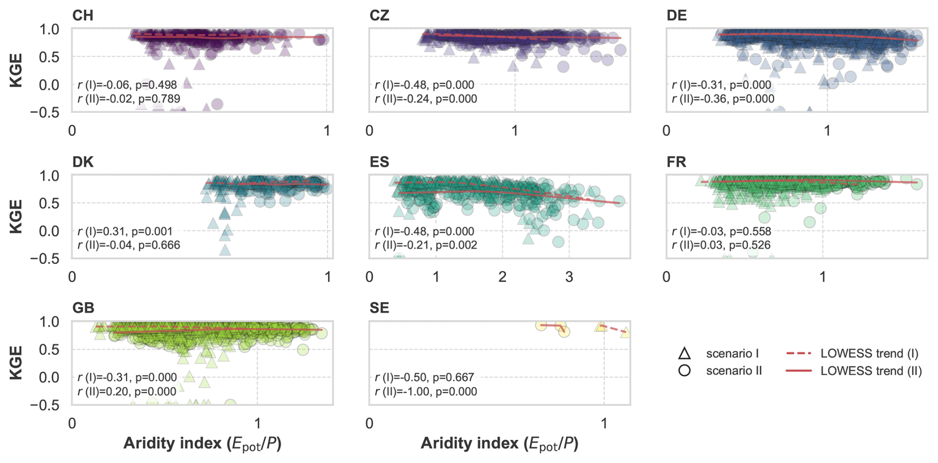 We calculated the Spearman rank correlation between model performance and several catchment attributes available in EStreams (see Table S1 and Fig. S5 in the Supplement). The number of E-OBS precipitation stations and the aridity index emerged as particularly interesting variables given their apparent relationships with model performance.