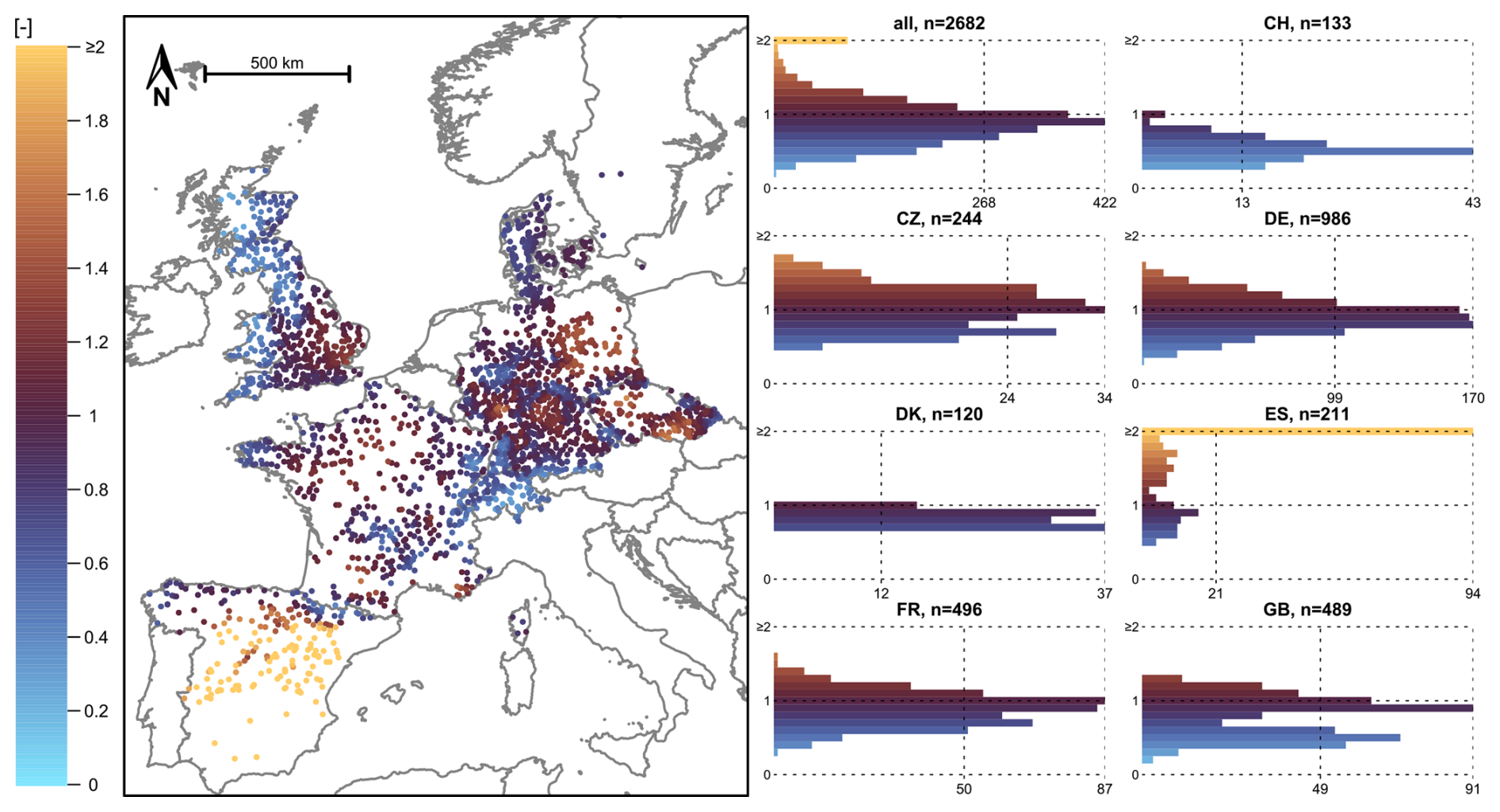 Due to the differences in the precipitation and the Epot data, the aridity indices () calculated from the two data sources differed, although they were still highly correlated (Pearson's correlation coefficient of 0.94) (Fig. 3). Given the lower precipitation and higher Epot sums for most catchments, the aridity indices were generally higher when the E-OBS data obtained from EStreams were used than when the CAMELS data were used. This did not apply for Sweden, as the Epot sums based on E-OBS were lower than the ones from CAMELS for this country. The two calculated aridity indices aligned best for Germany and worst for Spain, Great Britain, and Czechia. Spatially, the aridity indices derived from both datasets followed the expected pattern, with more arid catchments in southern Europe and north-eastern Germany and more humid catchments in the other regions (see Fig. A1 for the CAMELS data and Fig. A2 for the E-OBS data).