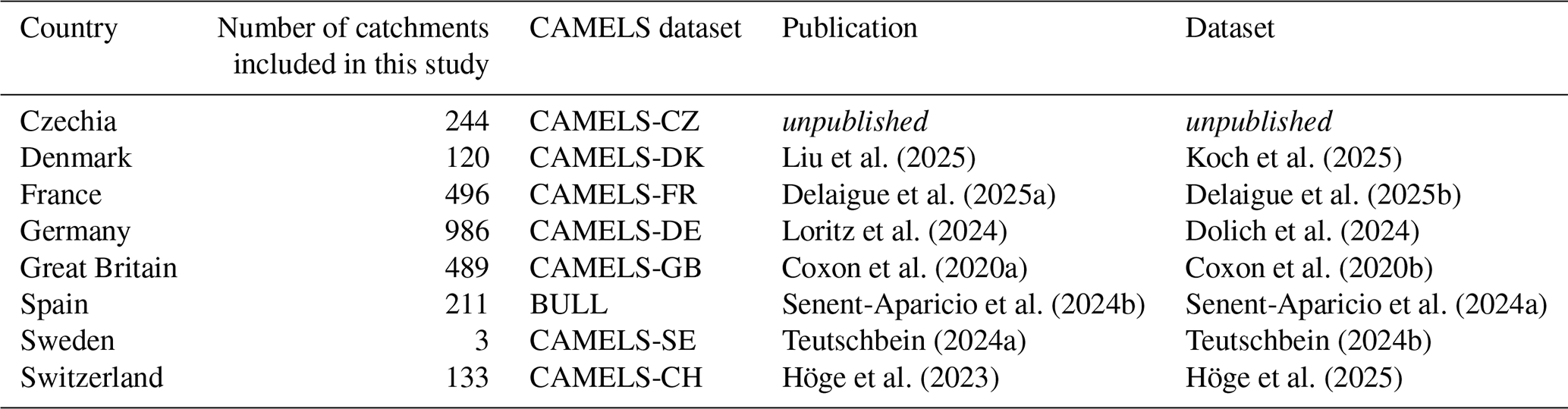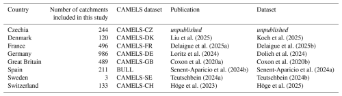 We conducted this study for 2682 catchments that are available in the EStreams dataset and catalogue and in one of the following datasets: CAMELS-CZ, CAMELS-DK, CAMELS-FR, CAMELS-DE, CAMELS-GB, BULL, CAMELS-SE, CAMELS-CH, for simplicity's sake referred to as the “CAMELS datasets” throughout the remainder of the paper (Table 1). These catchments fulfilled the following cascade of criteria (with the number of catchments still included after each step in brackets, see also Fig. S1 in the Supplement):