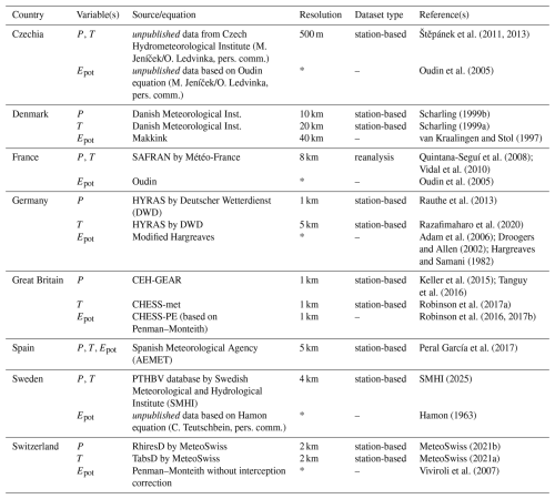 Table 2Overview of the data sources for the meteorological data (precipitation P, temperature T, and potential evapotranspiration Epot) for the different CAMELS datasets in this study.