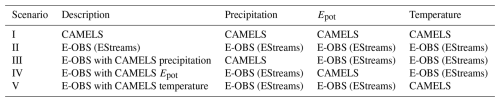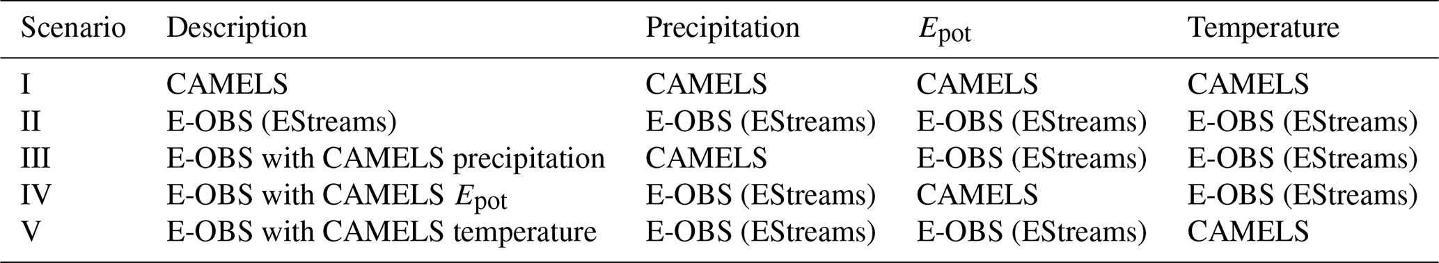 In the first two scenarios, we used the CAMELS forcing data (scenario I) or the E-OBS data obtained from EStreams (scenario II). To isolate the impact of the forcing variables, we additionally defined three mixed scenarios. Scenario III used precipitation from CAMELS and Epot and temperature from E-OBS. Similarly, scenario IV evaluated the effect of using only Epot from CAMELS, and consequently if using different Epot formulations would change our results, while scenario V assessed the effect of using only temperature from CAMELS. Note that due to the dependency of the E-OBS Epot data on the E-OBS temperature data, model calibration was influenced by the E-OBS temperature data even when replacing the temperature data from E-OBS with those from CAMELS (scenario V).