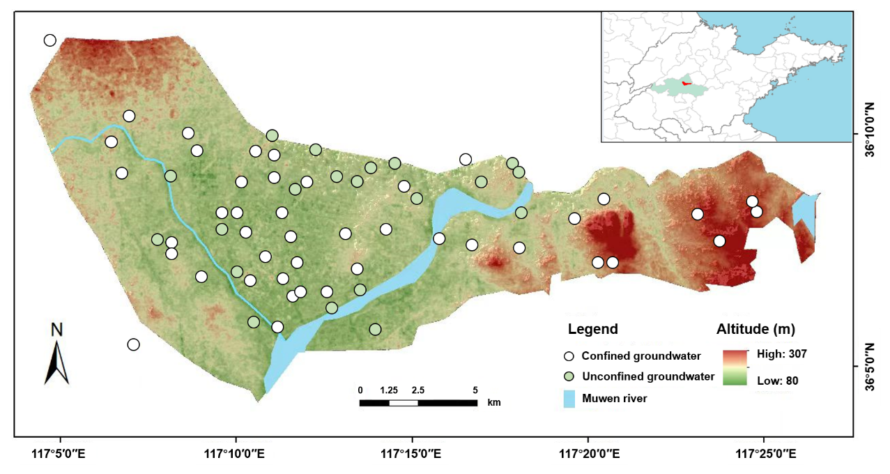 The study area is located on the western edge of the Tai-Lai Basin in the lower reaches of the Yellow River (Fig. 1), to the east of Tai'an urban area (117°0409′′–117°2645′′ E, 36°0416′′–36°1210′′ N), with a total area of approximately 220 km2. The topography is characterized as a proluvial and alluvial plain at the foot of Mount Tai, with an overall terrain slope from the northwest to the southeast. The study area falls within the temperate continental semi-humid monsoon climate zone, featuring hot and rainy summers, as well as cold and dry winters. The average annual temperature is 12.9 °C, and the average annual precipitation is 790.69 mm. Precipitation exhibits significant spatiotemporal variability, with uneven seasonal distribution and large interannual fluctuations. The primary aquifer formations in the study area consist of two types: the Quaternary unconsolidated porous aquifer group and the Cambrian-Ordovician carbonate rock fracture karst aquifer group. The former is mainly composed of medium to coarse sand, with recharge primarily from atmospheric precipitation and infiltration of surface water, and discharge through evaporation, artificial extraction, replenishment of surface water, and inter-aquifer flow to other aquifers. The latter is mostly situated beneath the Quaternary strata, with recharge mainly from “skylight” recharge of Quaternary water and lateral flow recharge from regional bedrock fracture aquifers, and discharge through artificial extraction, runoff discharge, and upward replenishment to the Quaternary porous water. The urban population in the study area is approximately 28 000, with over 85 % of the population engaged in agriculture and animal husbandry.