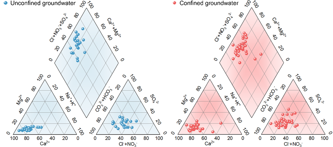 The type of groundwater in the study area is predominantly of the Ca-type, with the molar percentage of Ca2 exceeding 50 % in most sampling points (Fig. 2). In addition, the groundwater in the study area can be classified into two main types: ClNO3-HCO3--Ca2+ and ClNO3- SO4--Ca2+. Specifically, the Cl NO3-HCO3--Ca2+ type is primarily found in karst water, while the ClNO3- SO4--Ca2+ type is mainly distributed in pore water.