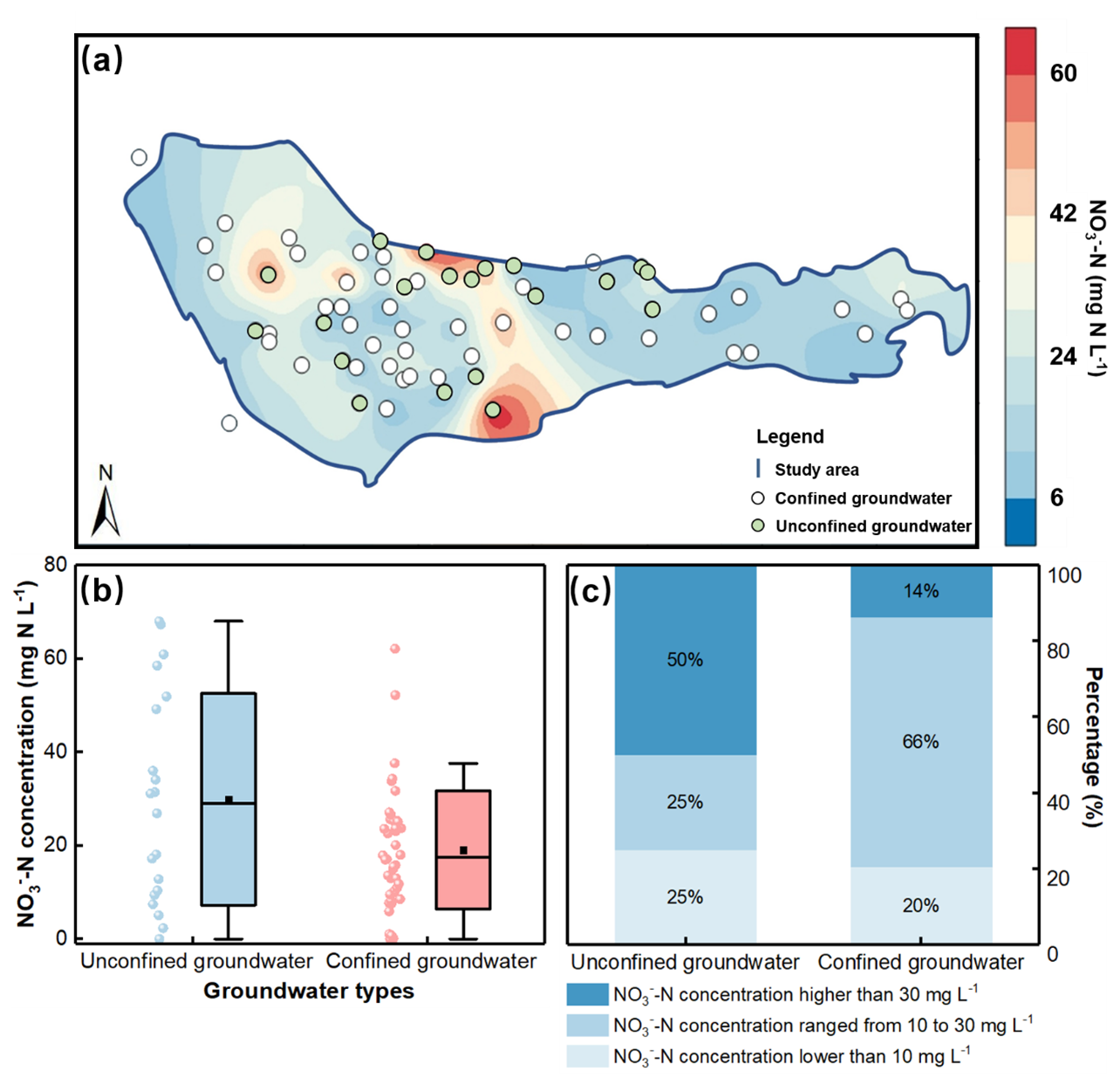 Figure 3(a) Spatial distribution map of NO3--N concentrations in unconfined and confined groundwater of the study region. (b) Boxplot of NO3--N concentrations. The dot and line represent mean value and median. (c) Percentages of NO3--N concentrations in unconfined groundwater and confined groundwater (< 10 mg N L−1, ranging from 10 to 30 mg N L−1, and > 50 mg N L−1).