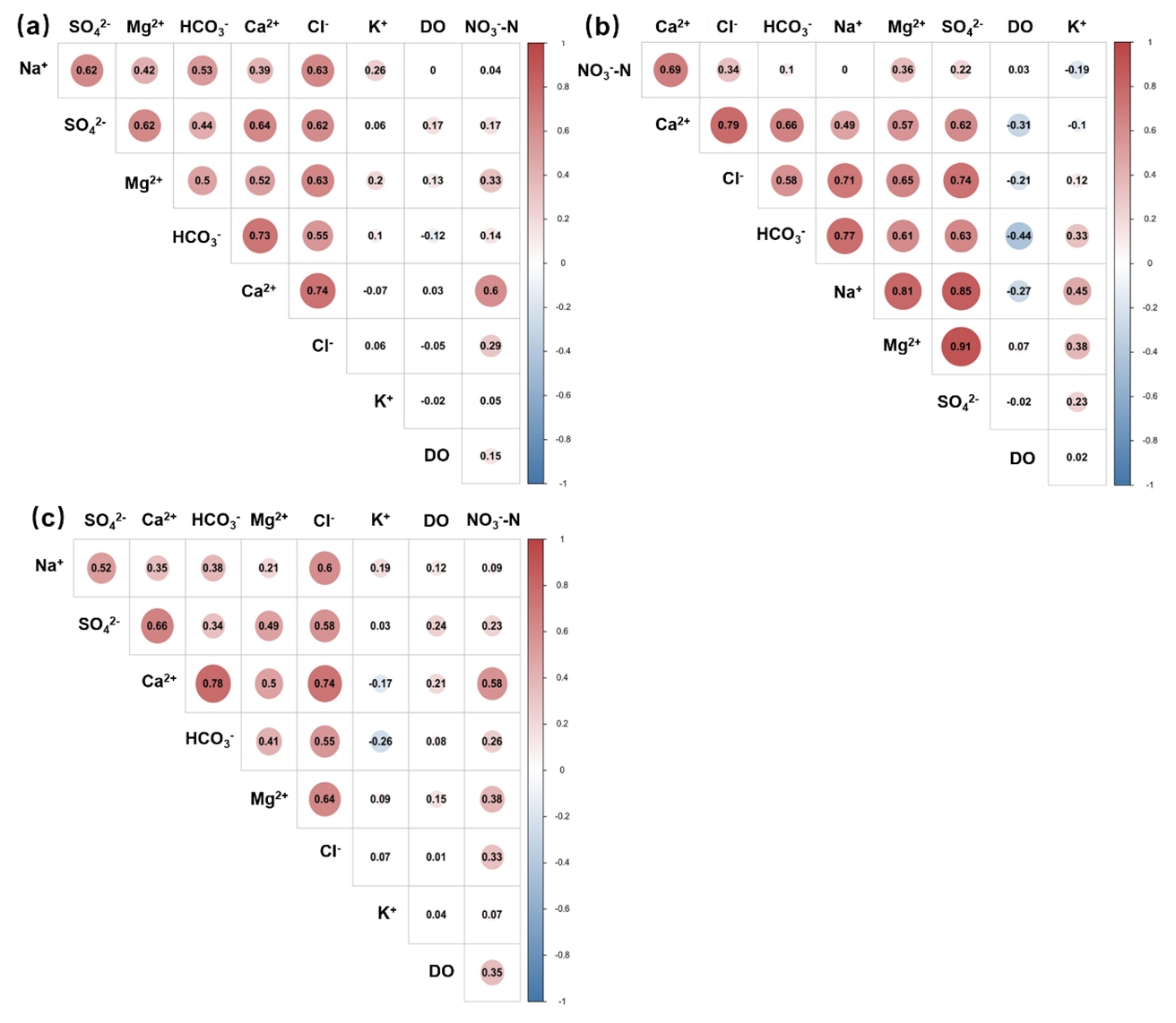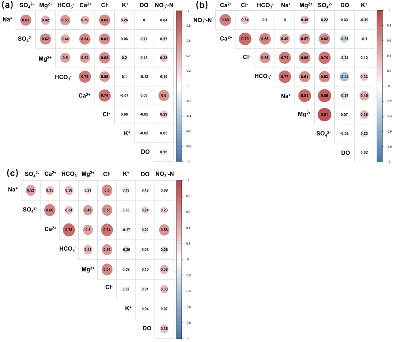 Figure 4Pearson correlation analysis of different hydrochemical indexes. (a) Generalized single-layer aquifer. (b) Actual double-layer aquifer (unconfined groundwater). (c) Actual double-layer aquifer (confined groundwater).