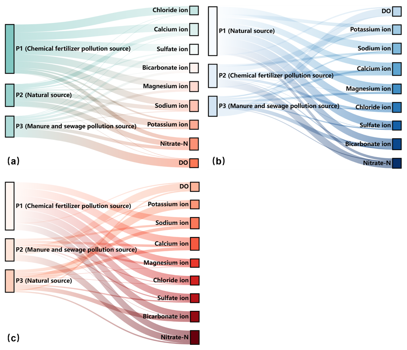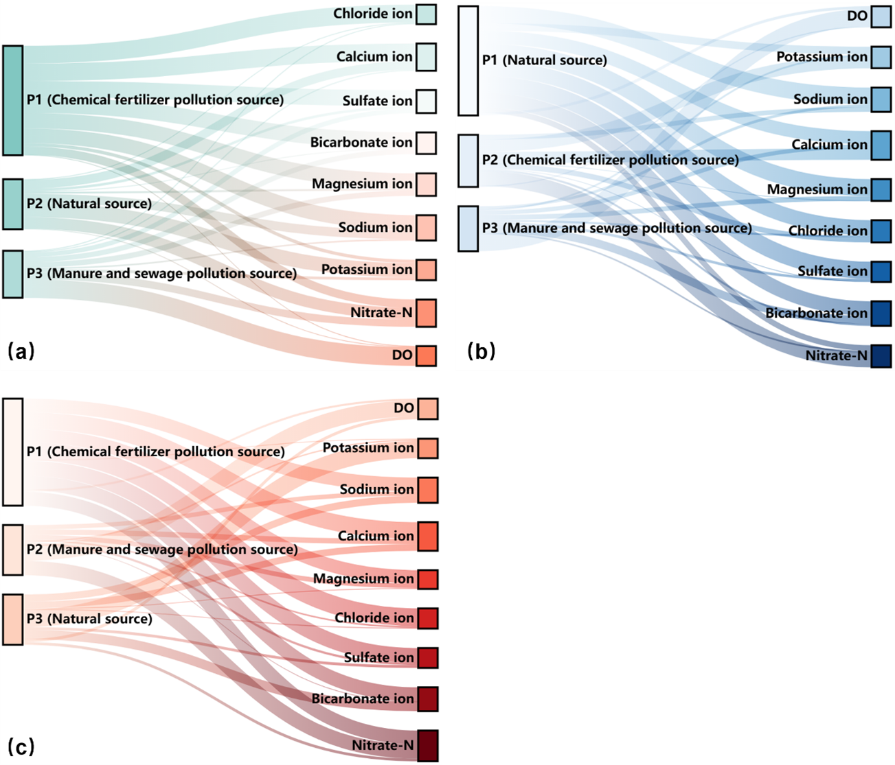 Figure 5Sankey graph of rotation factor load matrix for hydrochemical indexes. (a) Generalized single-layer aquifer. (b) Actual double-layer aquifer (unconfined groundwater).(c) Actual double-layer aquifer (confined groundwater).