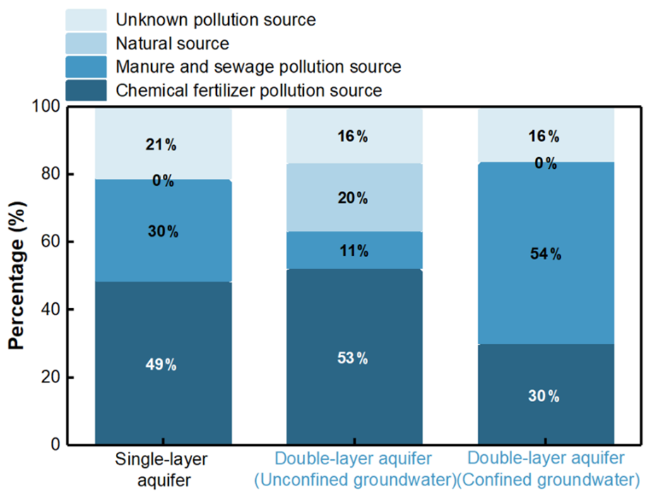 The accurate identification of NO3--N pollution sources are pivotal to the assessment of groundwater pollution risks. However, current studies on NO3--N source apportionment simplifies complex multi-layer aquifer systems into single-layer models without accounting for the impact of occurrence conditions. In this study, we quantitatively identify distinct NO3--N pollution sources in unconfined and confined groundwater, highlighting the critical role of occurrence conditions for management.