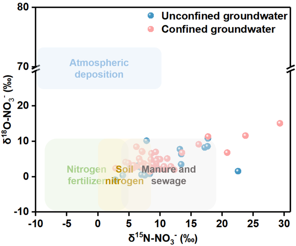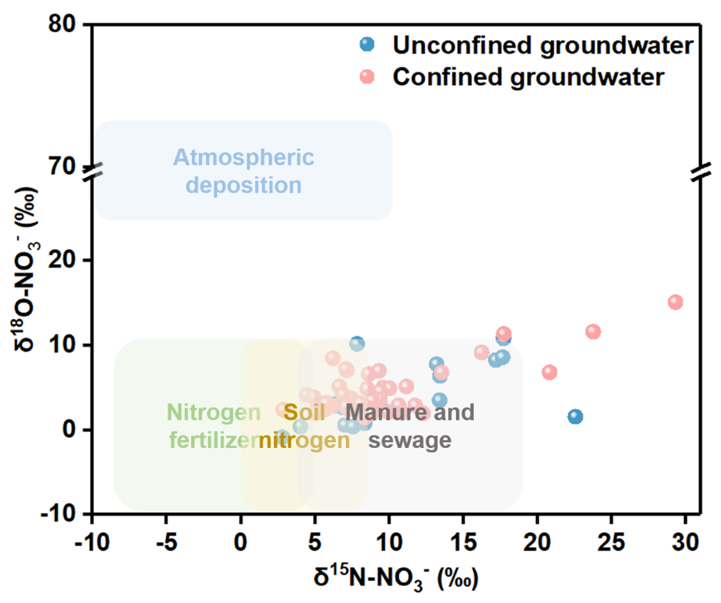 Current studies on NO3--N source apportionment in groundwater predominantly simplifies complex multi-layer aquifer systems into single-layer models (Yu et al., 2020). While this simplification facilitates analysis, it introduces substantial limitations due to fundamental differences between unconfined and confined aquifers in terms of recharge mechanisms, flow paths, hydraulic characteristics, and contaminant transport behavior (Liang et al., 2017). Unconfined aquifers, characterized by strong connectivity with surface water, are highly vulnerable to anthropogenic activities (e.g., agricultural fertilization, industrial effluents, and domestic sewage), allowing contaminants to readily leach into groundwater through precipitation or surface runoff, resulting in rapid NO3--N accumulation that typically reflects recent pollution caused by recent human activities (Gutiérrez et al., 2018). In contrast, confined aquifers, protected by overlying aquitards, exhibit slower contaminant migration, with NO3--N pollution often representing legacy effects from historical agricultural practices (Wong et al., 2015). In addition, the transformation rates of nitrogen components from different pollution sources vary in aquifers with different occurrence conditions. Unconfined aquifers are generally aerobic environments, where the mineralization and nitrification of organic nitrogen occur rapidly, leading to a swift increase in NO3--N concentration (Liu et al., 2022). In contrast, confined aquifers tend to have reducing conditions, which restrict the nitrogen transformation rate and cause a lag in NO3--N formation (Ma et al., 2019). As a result, the source of NO3--N may be mistakenly attributed to other pollution sources.