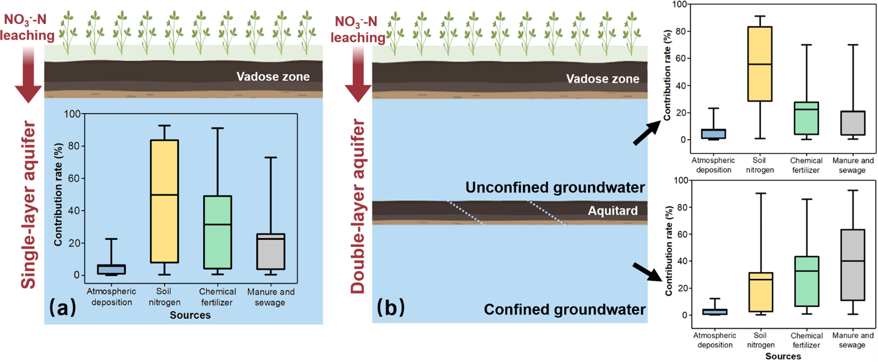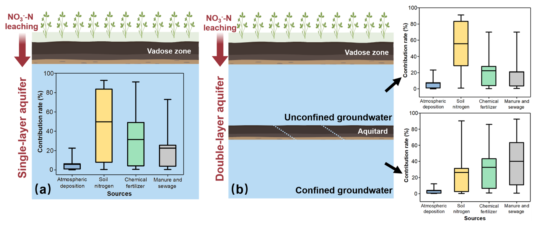 Figure 9Quantitative apportionment of NO3--N source based on the MixSIAR method. (a) Generalized single-layer aquifer. (b) Actual double-layer aquifer.