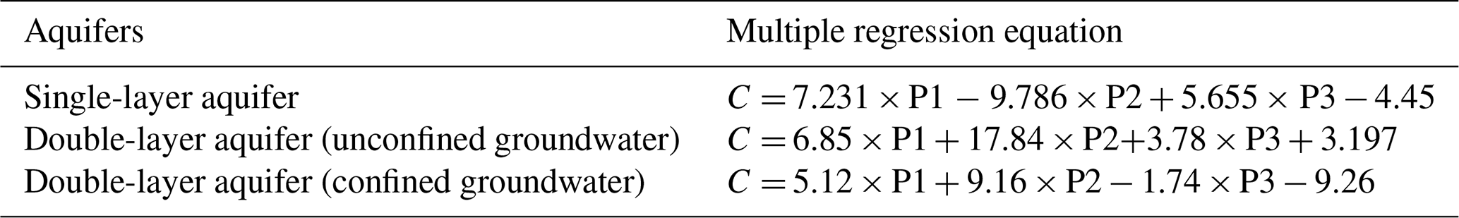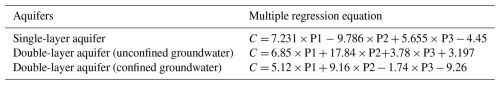 Following the qualitative identification of the major pollution sources, the APCS-MLR method was employed to quantitatively analyze the pollution sources (Table 1). For the generalized single-layer aquifer, the regression equation between NO3--N concentration and the absolute principal component scores was established as: C= 7.231 × P1  9.786 × P2 + 5.655 × P3  4.45 (R2= 0.789, p<0.01). This regression model explains 78.9 % of the variation in NO3--N concentration, with the remaining 21.1 % attributable to unknown pollution sources. For the actual double-layer aquifer, in the unconfined aquifer, the regression equation between NO3--N concentration and the absolute principal component scores is: C= 6.85 × P1 + 17.84 × P2 + 3.78 × P3 + 3.197 (R2= 0.838, p<0.01), explaining 83.8 % of the variation in NO3--N concentration, and the remaining 16.2 % is attributed to unknown pollution sources. In the confined aquifer, the regression equation is: C= 5.12 × P1 + 9.16 × P2  1.74 × P3  9.26 (R2= 0.841, p<0.01), accounting for 84.1 % of the variation in NO3--N concentration, with the remaining 15.9 % attributed to unknown pollution sources.