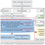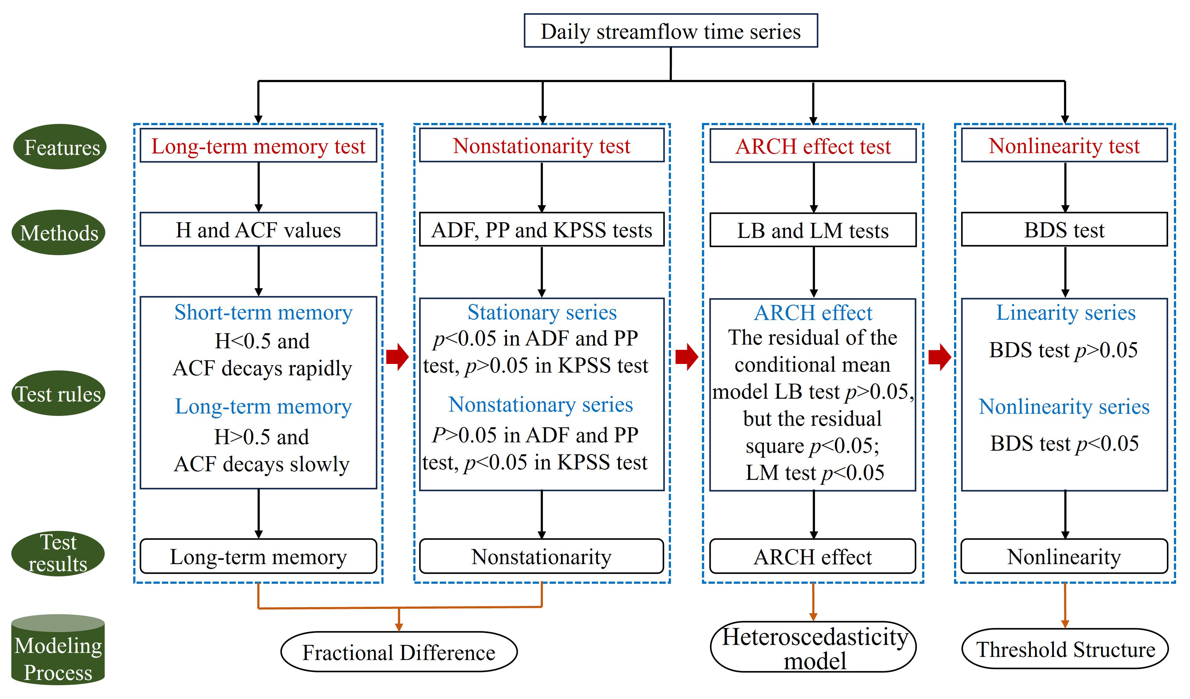 The daily streamflow time series exhibits seasonal characteristics due to the cyclical influence of the four seasons. Therefore, deseasonalization is a necessary preprocessing step before modeling. In this section, the presence of long-term memory in the daily streamflow series is identified by the Hurst exponent (H) calculated using the rescaled range (R/S) analysis method and the trend of the autocorrelation function (ACF). The influence of seasonality on long-term memory is also assessed (Lo, 1991). On this basis, the stationarity of the series is evaluated using three unit root tests: the Augmented Dickey-Fuller (ADF), Phillips-Perron (PP), and Kwiatkowski-Phillips-Schmidt-Shin (KPSS) tests (Dickey and Fuller, 1981; Kwiatkowski et al., 1992; Peter and Perron, 1988). The null hypotheses of the ADF and PP tests assume that the time series has a unit root, while the KPSS test considers the null hypothesis as the time series being a stationary process. Due to the tendency of unit root tests to favor the null hypothesis, to rigorously determine the non-stationarity of the daily streamflow time series, if any of the three methods indicates the presence of a unit root process, then the daily streamflow time series at that station is considered non-stationary. Stationarity is a fundamental prerequisite for model construction. The method of achieving stationarity differs depending on the presence of long memory: non-long-memory series are differenced using integer orders, while long-memory series require fractional differencing. Subsequently, the Lagrange Multiplier (LM) tests is employed to detect the presence of ARCH effects, which is the most critical link in choosing to build a heteroscedastic model in this study (Ljung and Box, 1978). The ARCH effect reflects the limitations of linear regression models and highlights the necessity of characterizing the variation in second-order moments. Some studies have suggested a close relationship between ARCH effects and long-term memory in hydrological time series, neglecting long-term memory may lead to spurious detection of ARCH effects (Wang et al., 2023b, c). Finally, the Brock, Dechert, and Scheinkman (BDS) test is applied to examine whether the series exhibited nonlinear dynamics (Broock et al., 1996). The null hypothesis (H0) of the BDS test is that the time series is independently and identically distributed (i.i.d.). If the null hypothesis is rejected (p<0.05), it indicates that the series is not i.i.d. and is a nonlinear stochastic process. Since most existing heteroscedastic models are constructed based on linear structures, if the series demonstrates significant nonlinearity, it may be necessary to improve the model expression accordingly.